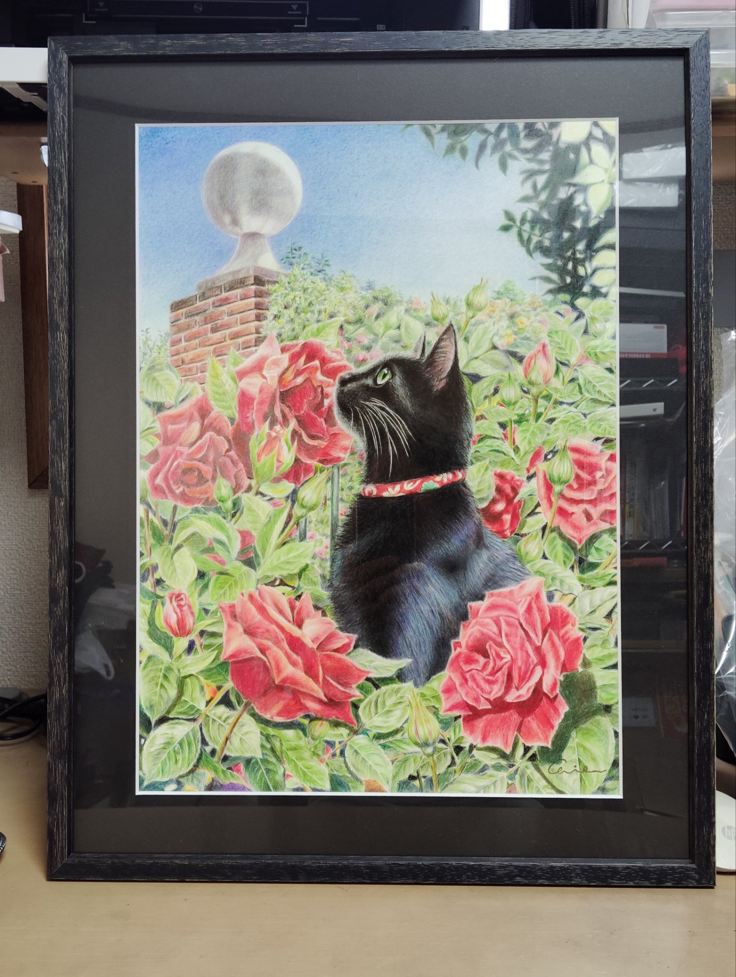 黒猫の色鉛筆画に合わせ、シュミレーションして黒い額と黒いマットを購入。作品が締まり、購入して良かったです!