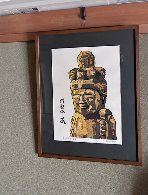 木版画、タイトルは「慈悲の心を刻む」。墨色のマットにブラウンの木製フレームで落ち着いた和の雰囲気で額装しました。