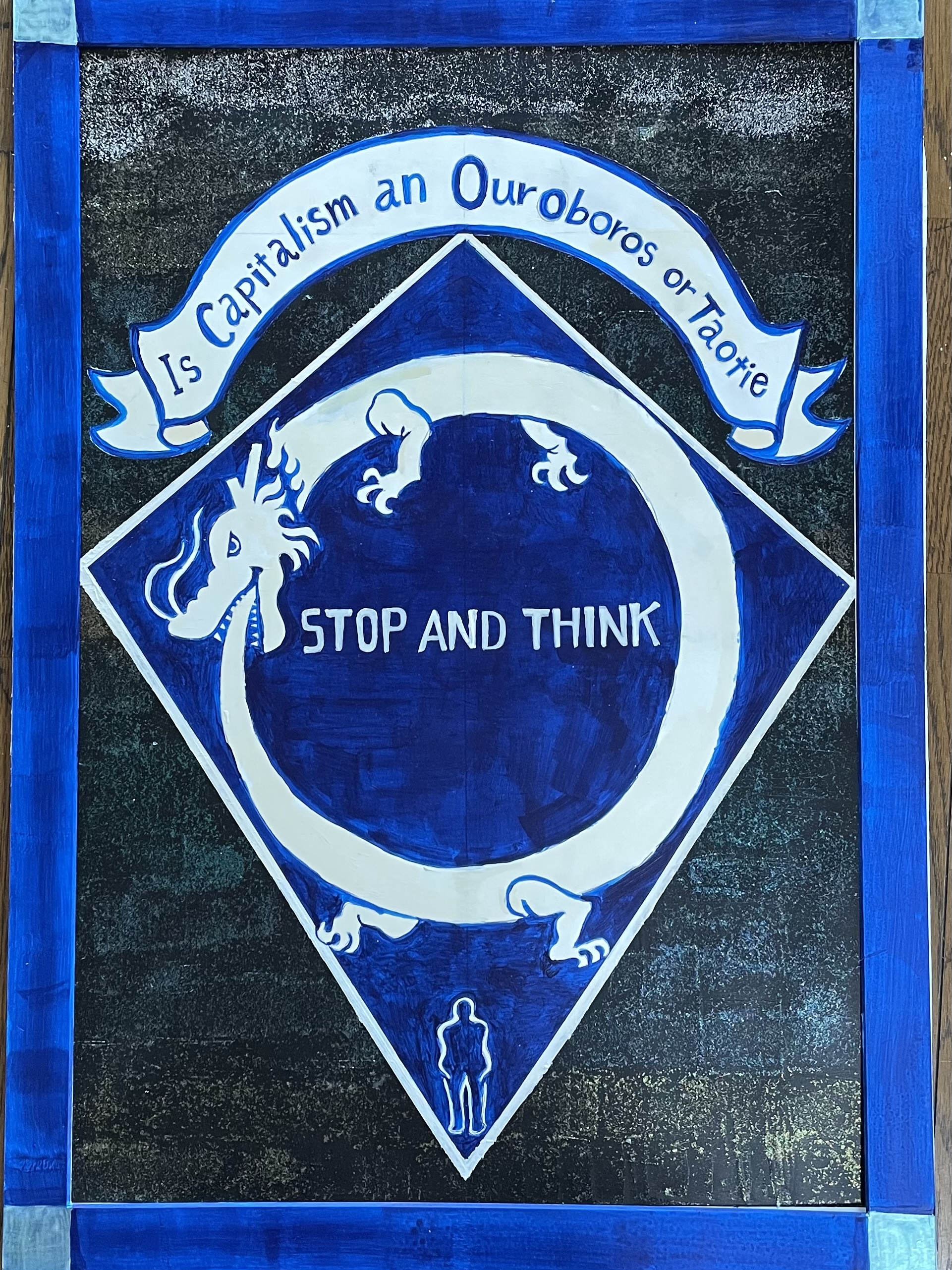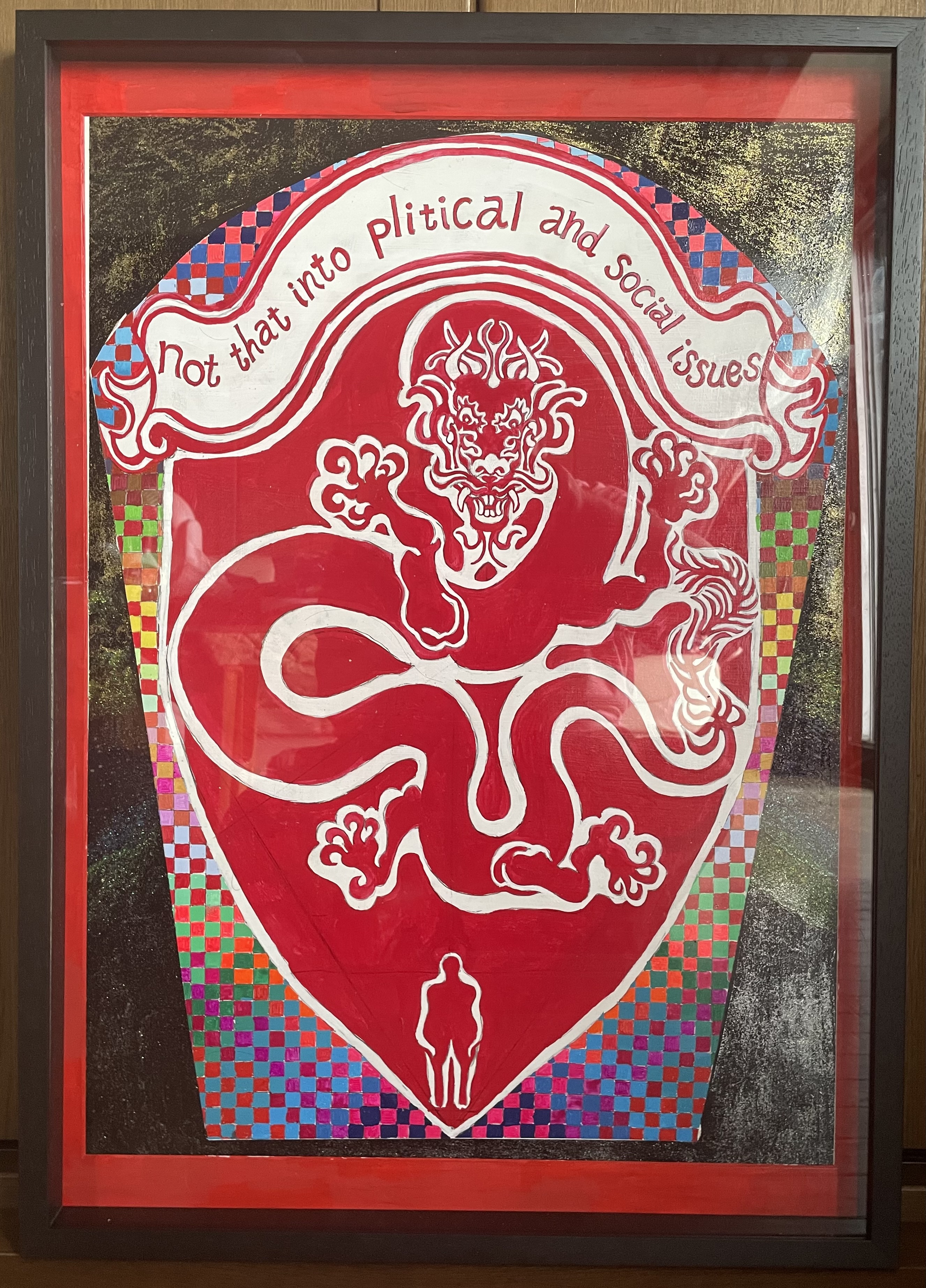 青い作品は「注意標識」としての役割を果たしています。自らの尾を噛むウロボロス(または饕餮)の龍が描かれ、「資本主義はウロボロスか饕餮か?」という問いが記されています。中央の「STOP AND THINK(立ち止まって考えろ)」というメッセージは、見る者に立ち止まり、深く考察することを促しています 赤い作品は「警告標識」です。こちらの龍はより攻撃的で躍動的なポーズで描かれ、上部のバナーには「政治的・社会的課題には関心がない(not into political and social issues)」という皮肉めいたメッセージが記されています。