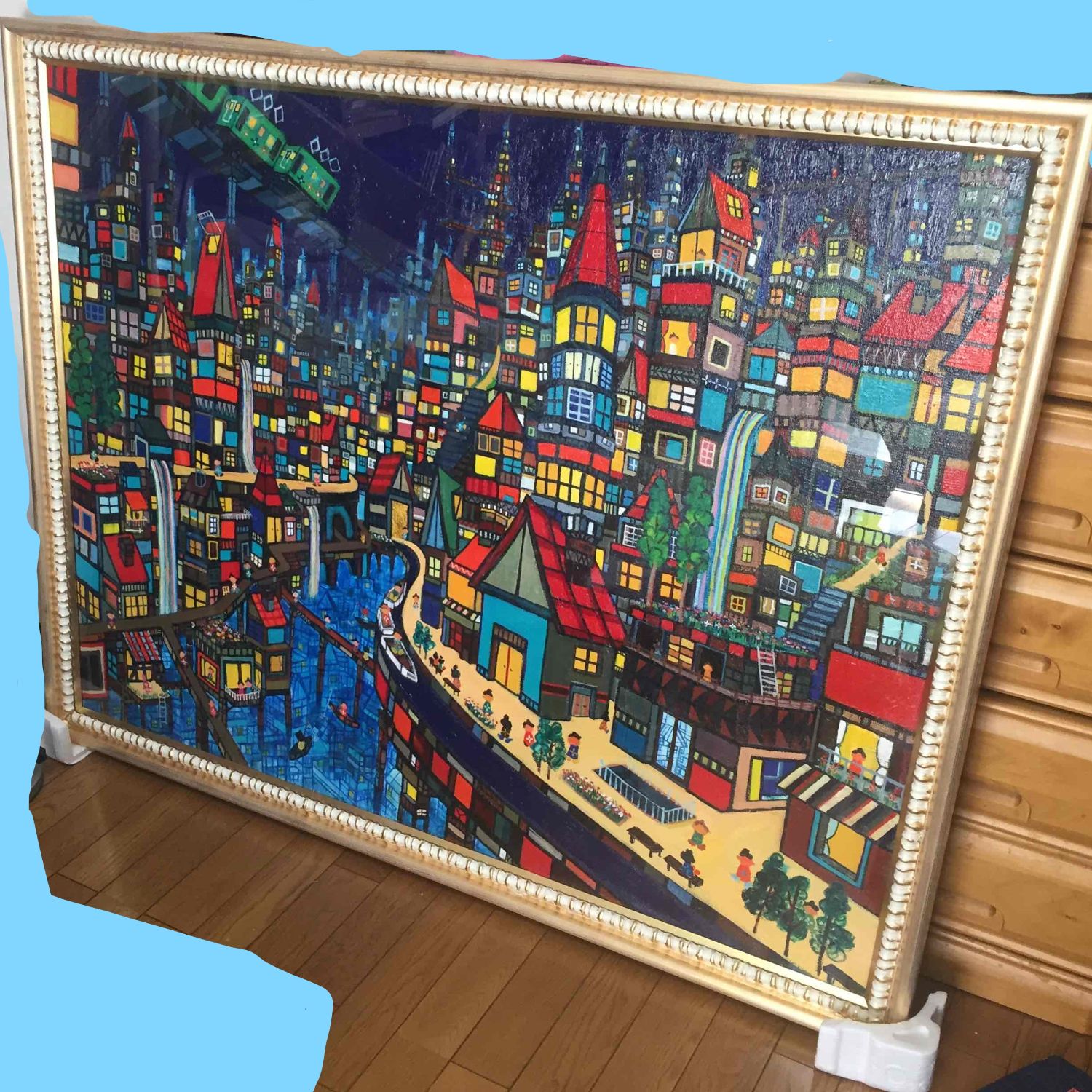 32-6743(現在取り扱い無し)のオーダー額をご注文頂きました。 鮮やかな色合いの街並みに、華やかなカラーリングを施したオーダーフレームがよくマッチしております。 お家の中で、このサイズの絵画のこの鮮やかな色彩は、とても存在感がありますね~。