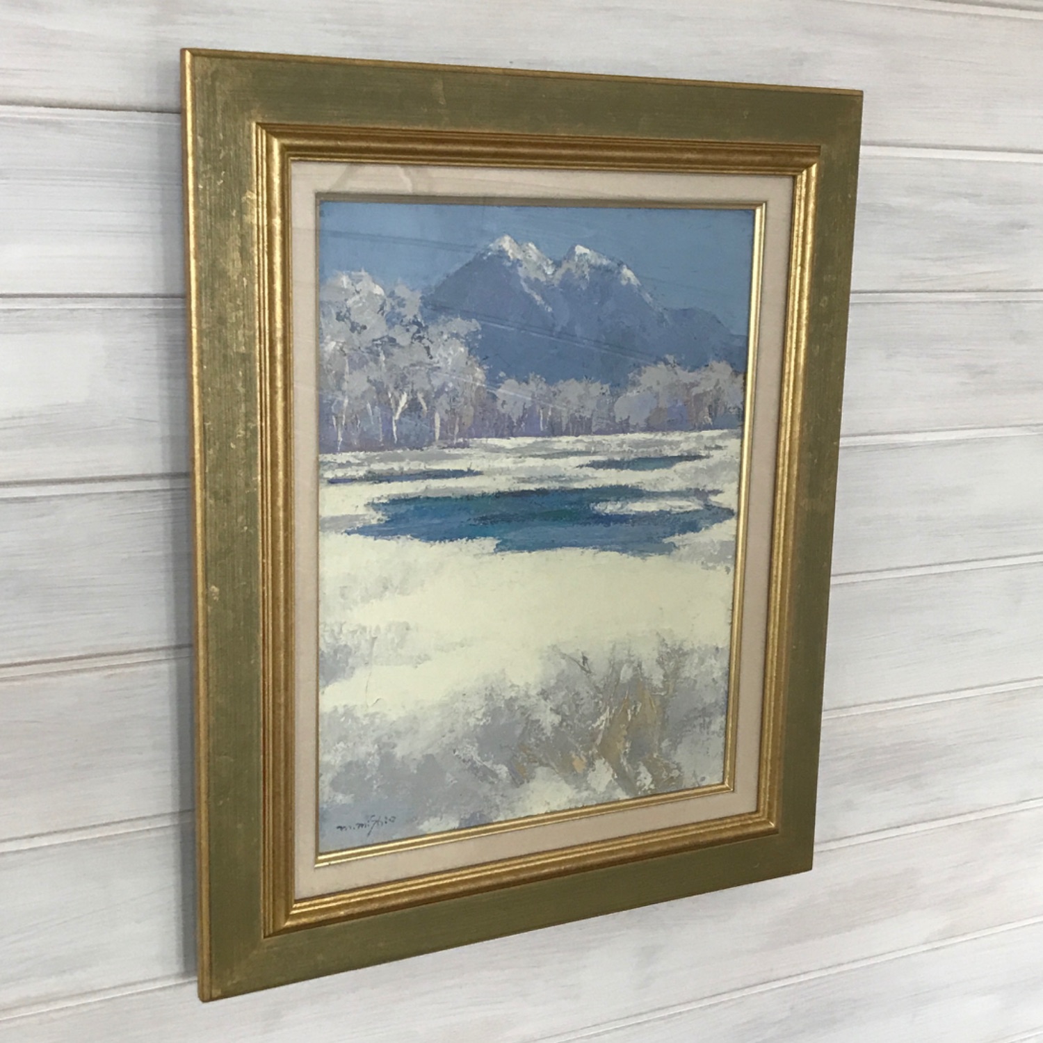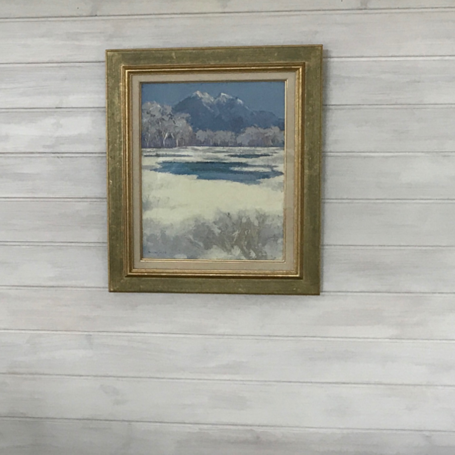 渋いゴールドのフレームが白と青の作品によく似合っています!派手すぎない色なのでナチュラルなホワイトの壁にも馴染んだ額装になっていますね✨静かな風景画に引き込まれそうで素敵です!