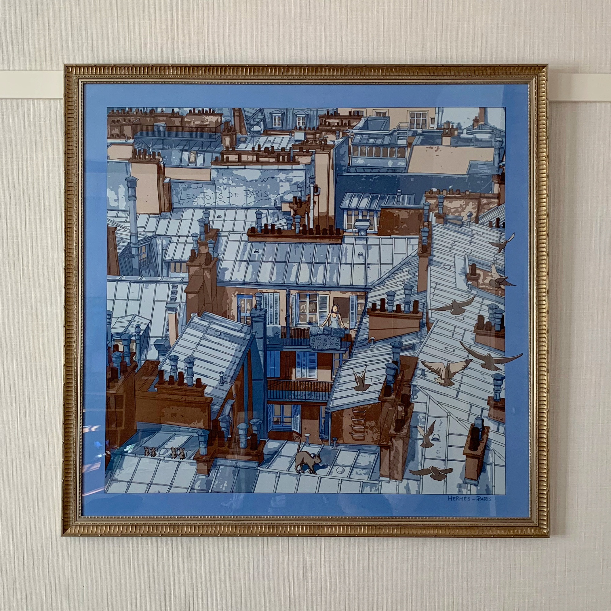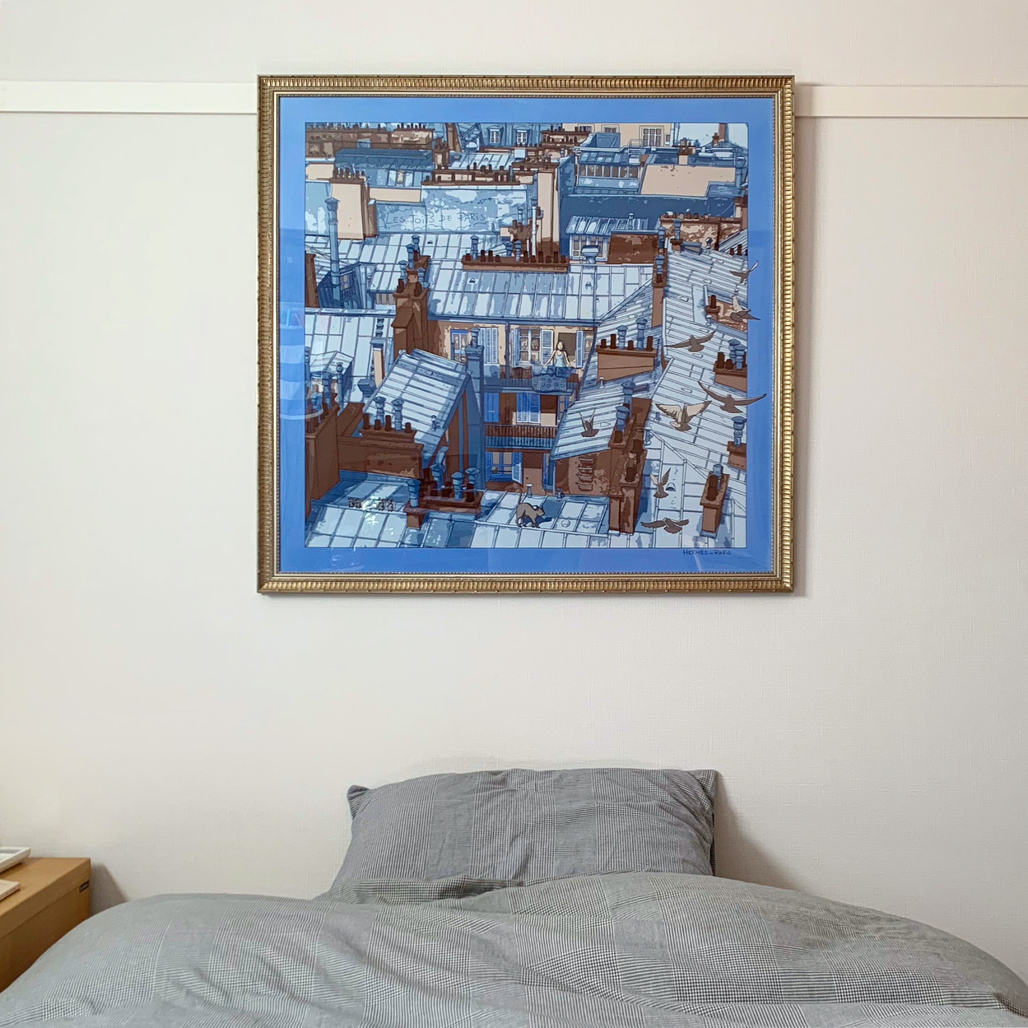 10-6513の額オーダーでご注文頂きました。 エルメスの青が印象的なパリのスカーフがアンティークシルバーの額と、とてもマッチしてますね。 寝室に飾ってあるようなので、さぞ良い夢が見れることでしょう。