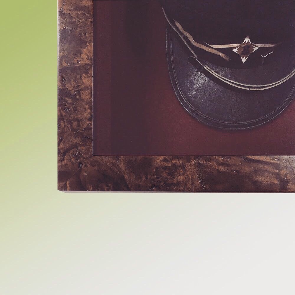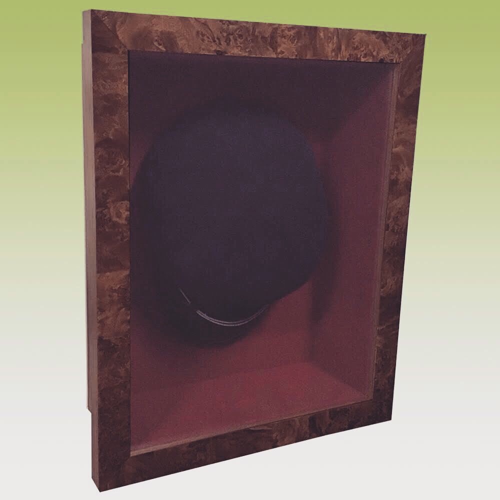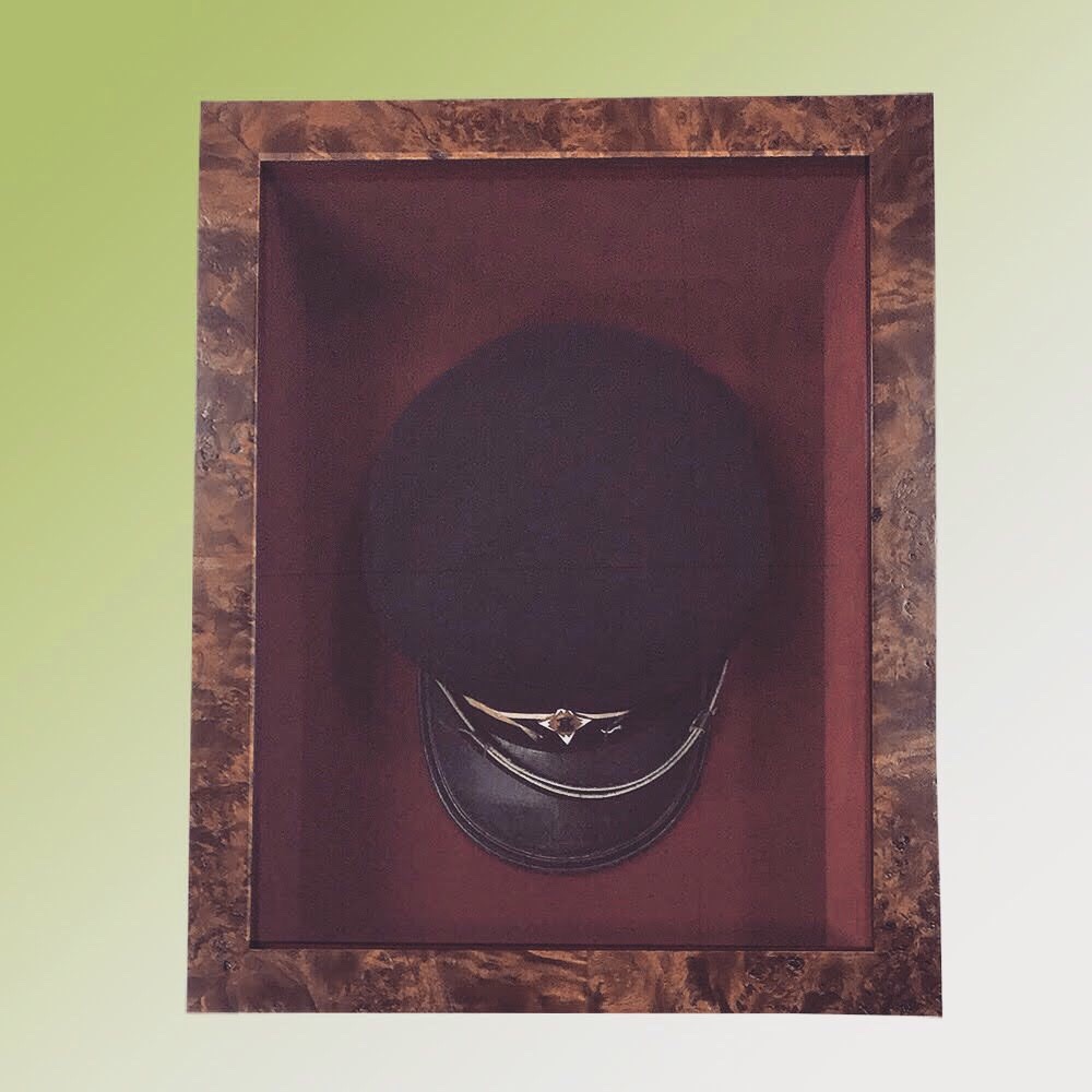 県ヶ丘高校で昔使用されていた学生帽を額装しました! 使用したフレームは「18-3058」、額の内側の側面と底面にはエンジ色の布が施してあります!学生帽は底面にしっかり縫い付けてあるので、額の中でズレたり落ちたりする心配はありません。