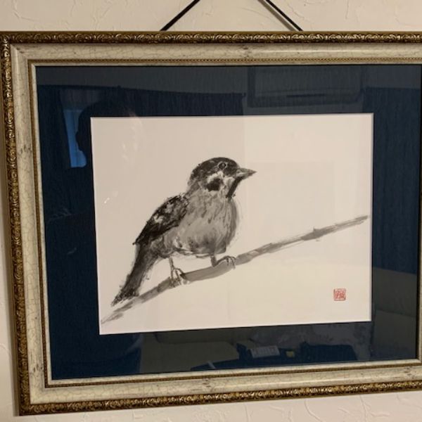 F4サイズで水墨画を書いてみました。すずめになります。額装してとてもよくなりました。