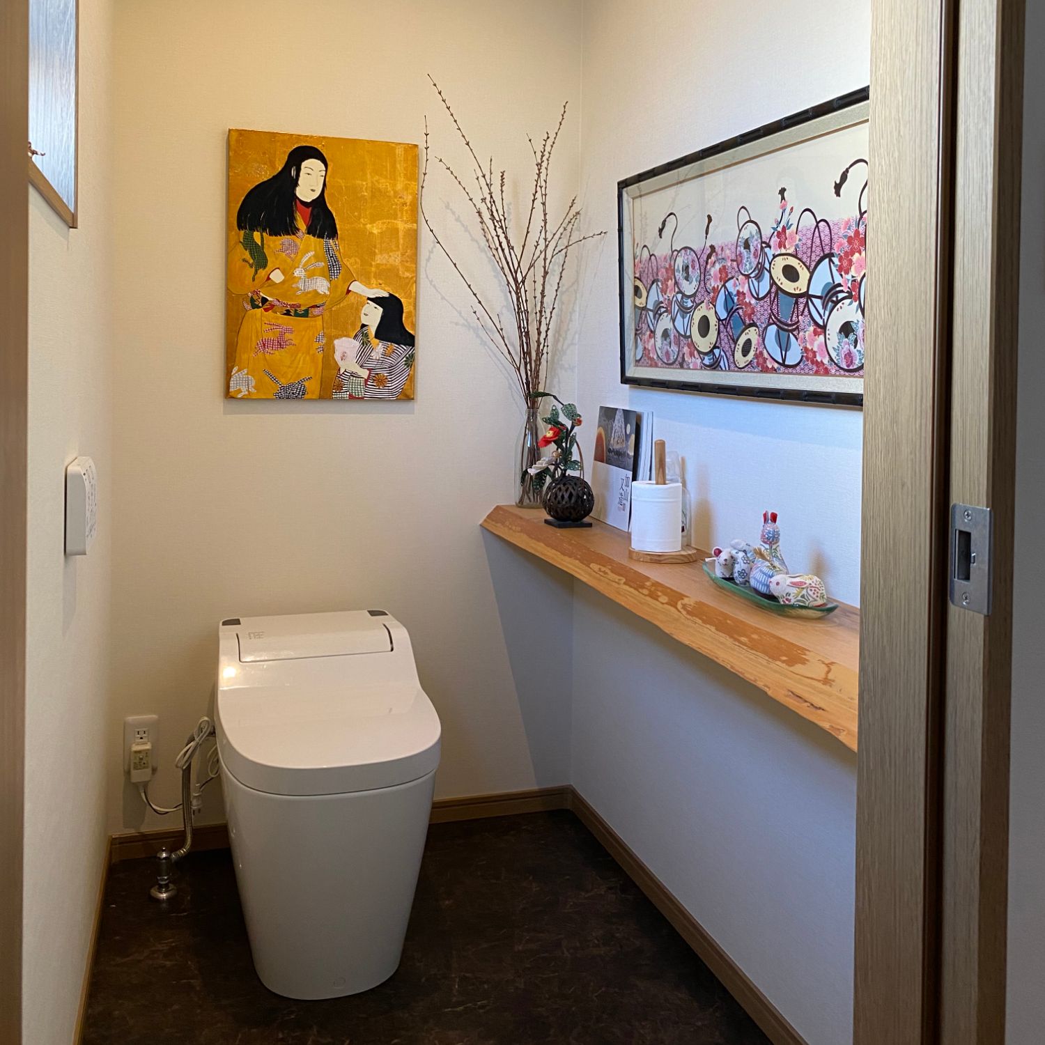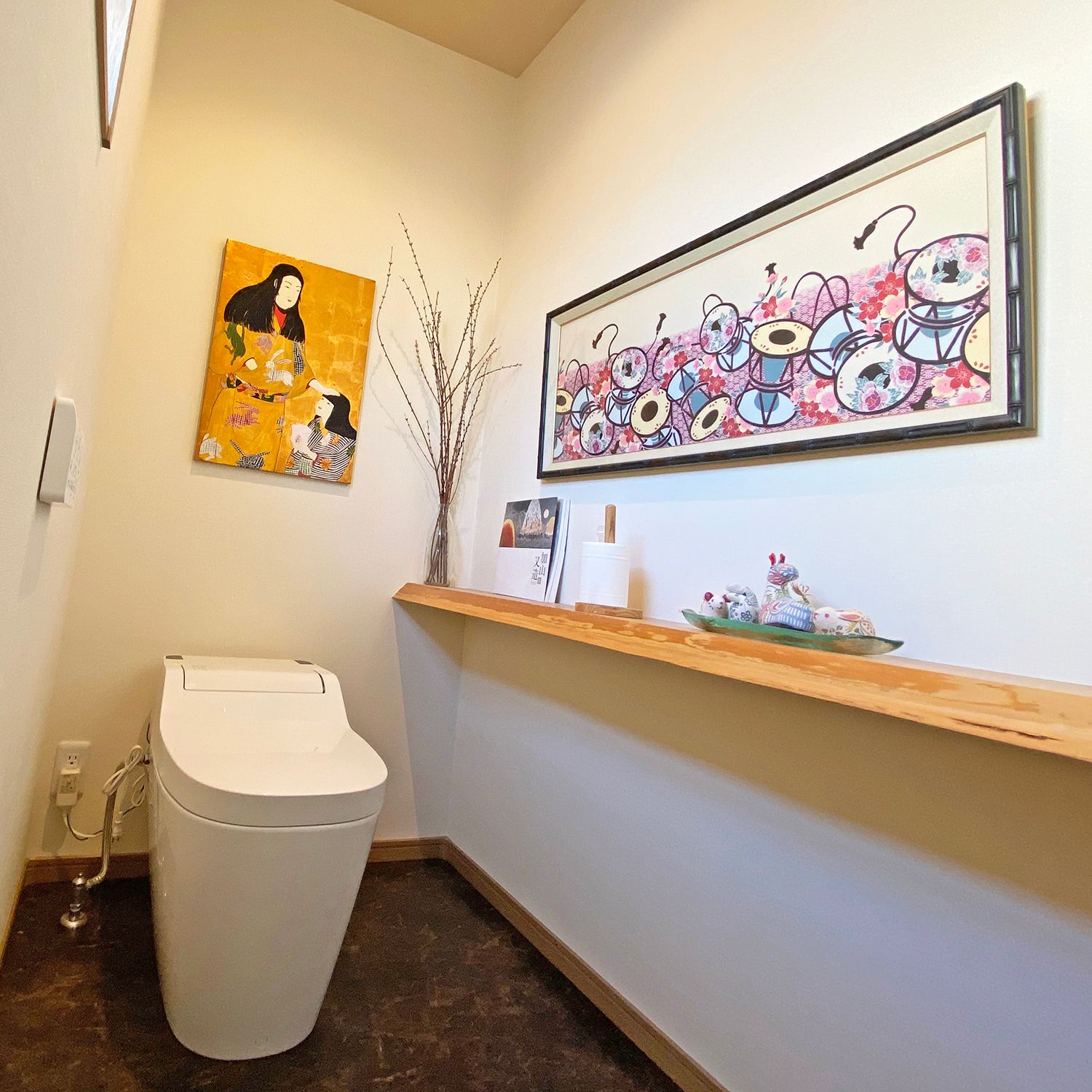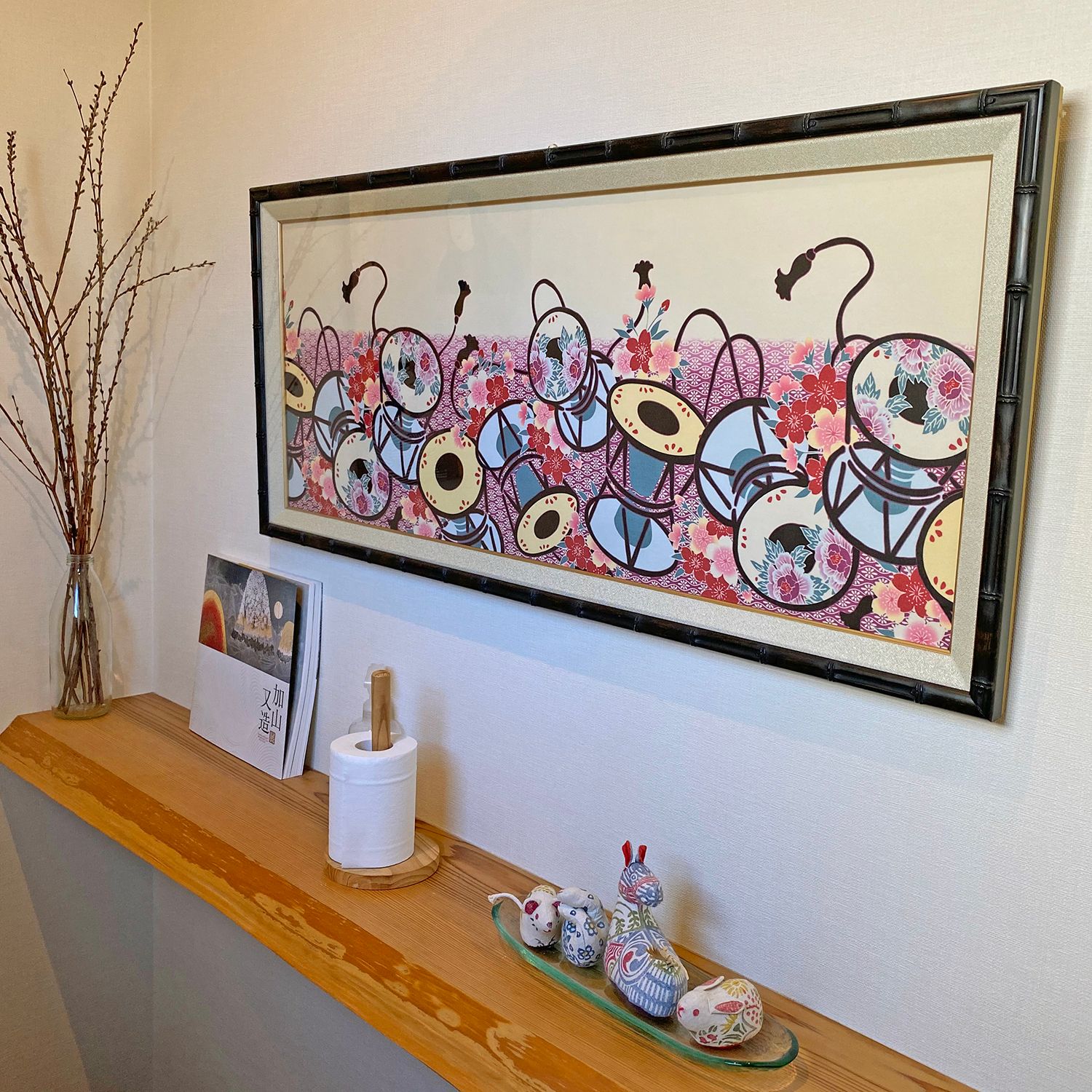和モダンを意識したトイレに、フルオーダーの手ぬぐい額を飾りました!奥行きのある凝った構造、竹を模したフレームがいい感じ。横長の棚の上に横長の手ぬぐいで、まとまりが良く気に入っています♪