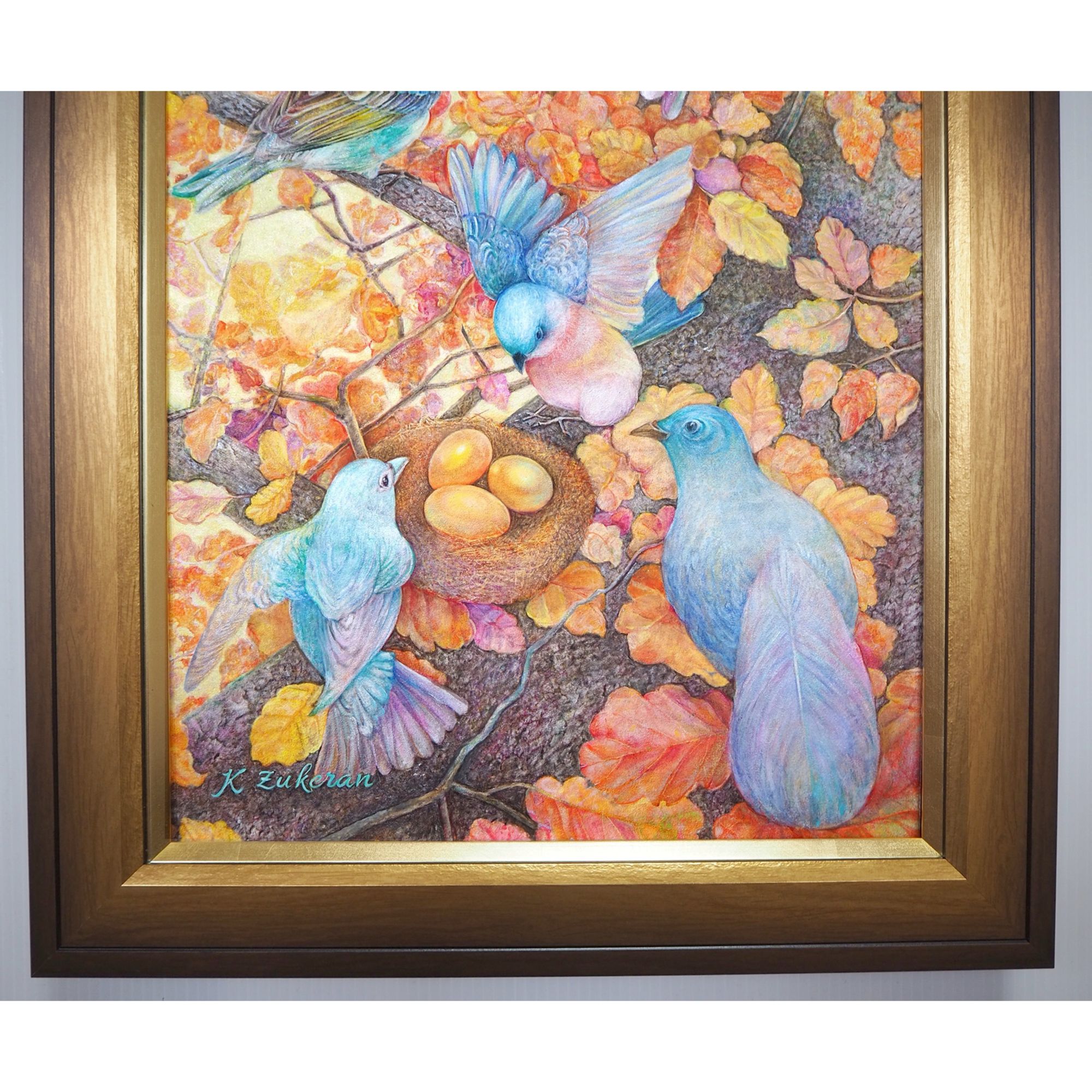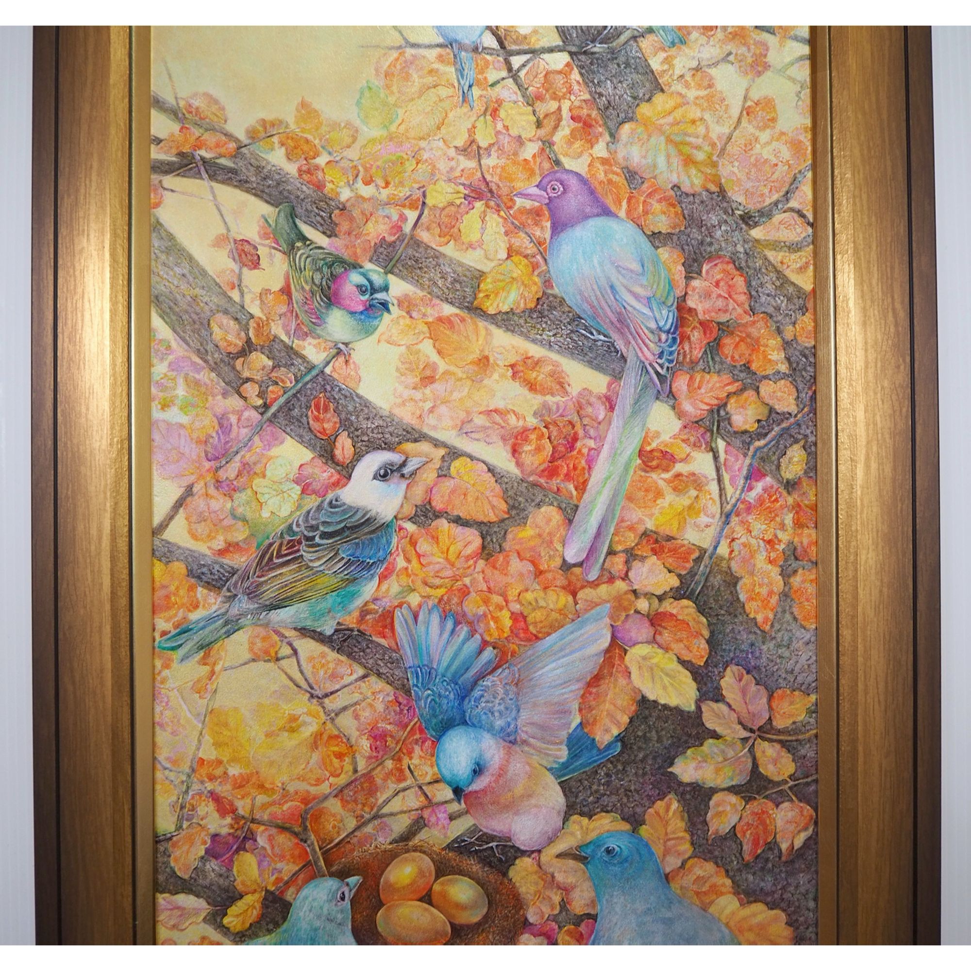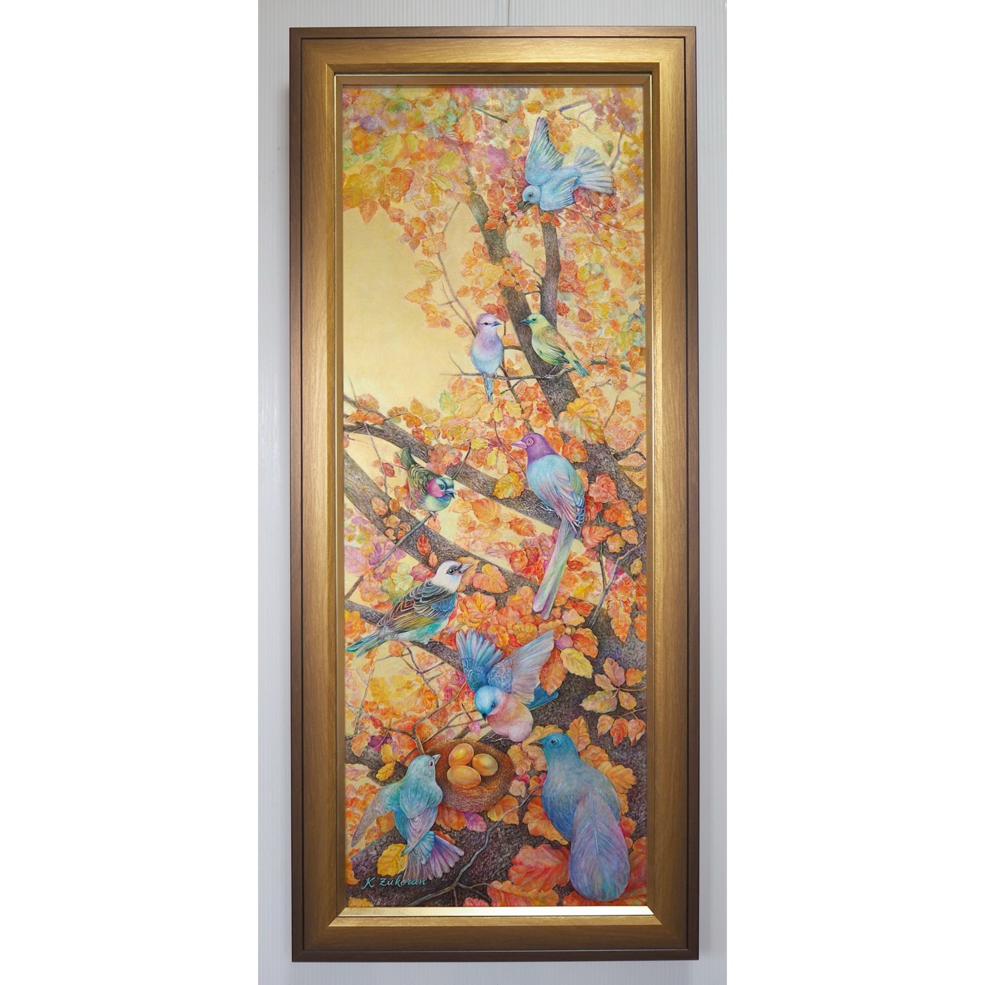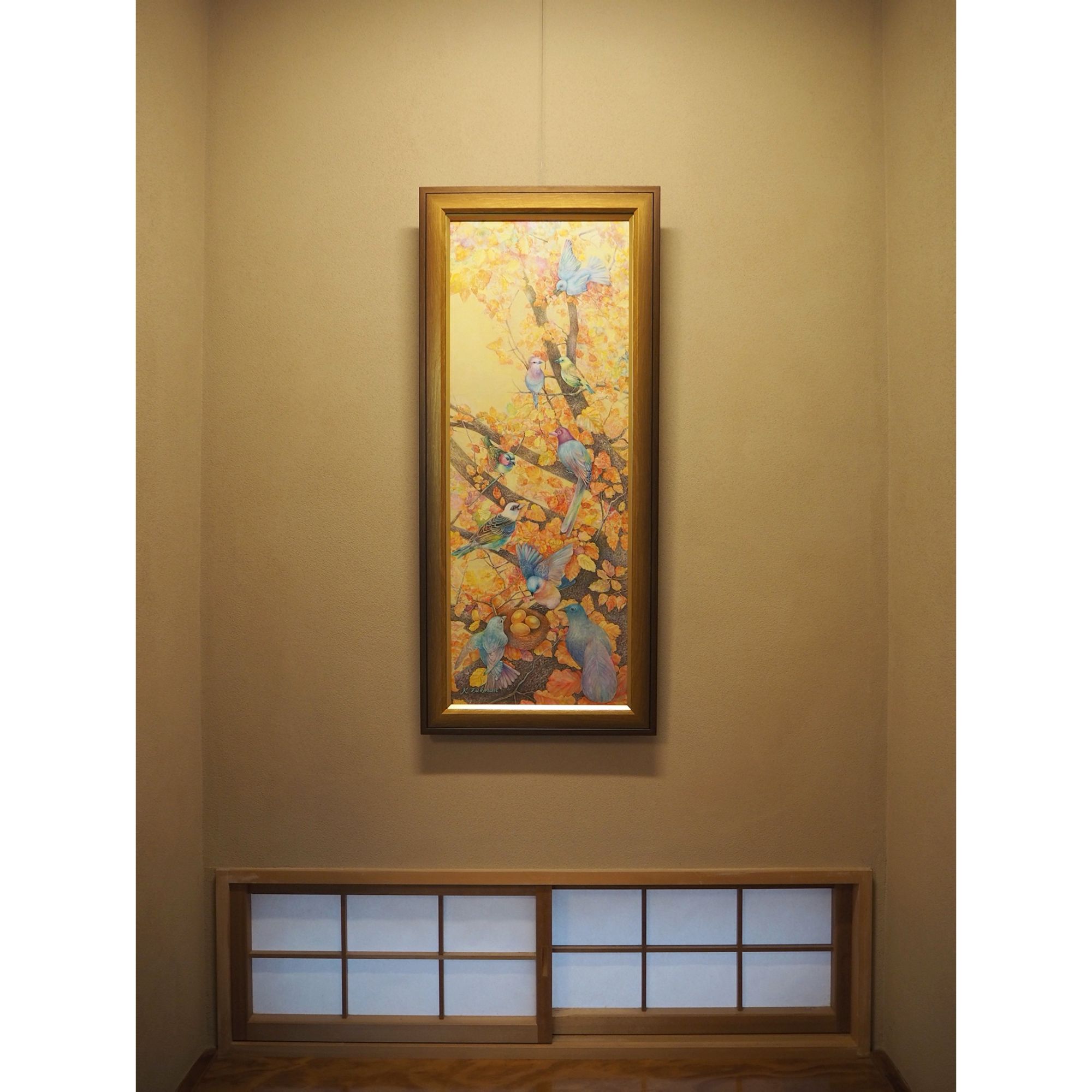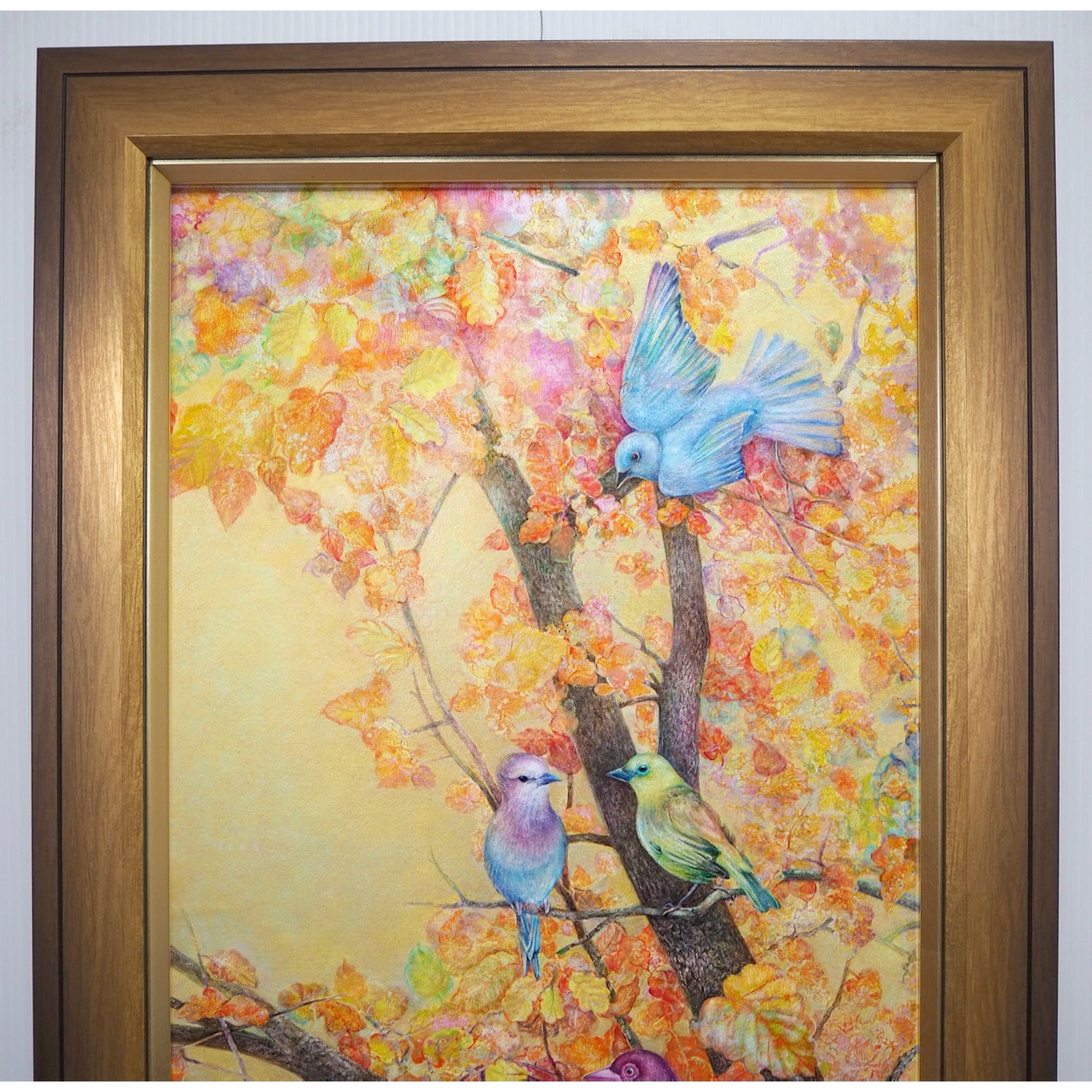 作品名:「紅葉の瑠璃鳥」 作家名:瑞慶覧 かおり 技法/サイズ:フレスコ画/89.0×33.0㎝ 額:MDF5800 ゴールド/890 × 330/6/LTゴールド/アクリル付