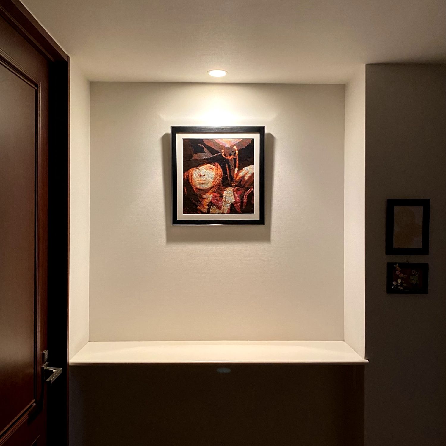 愛の籠ったクロスステッチ作品ですね🥰糸で再現されているお姿に、温かみも感じられます✨また、お選び頂いたフレーム「モントレ ビター」が全体を引き締めて、仕上がりもカッコイイです!