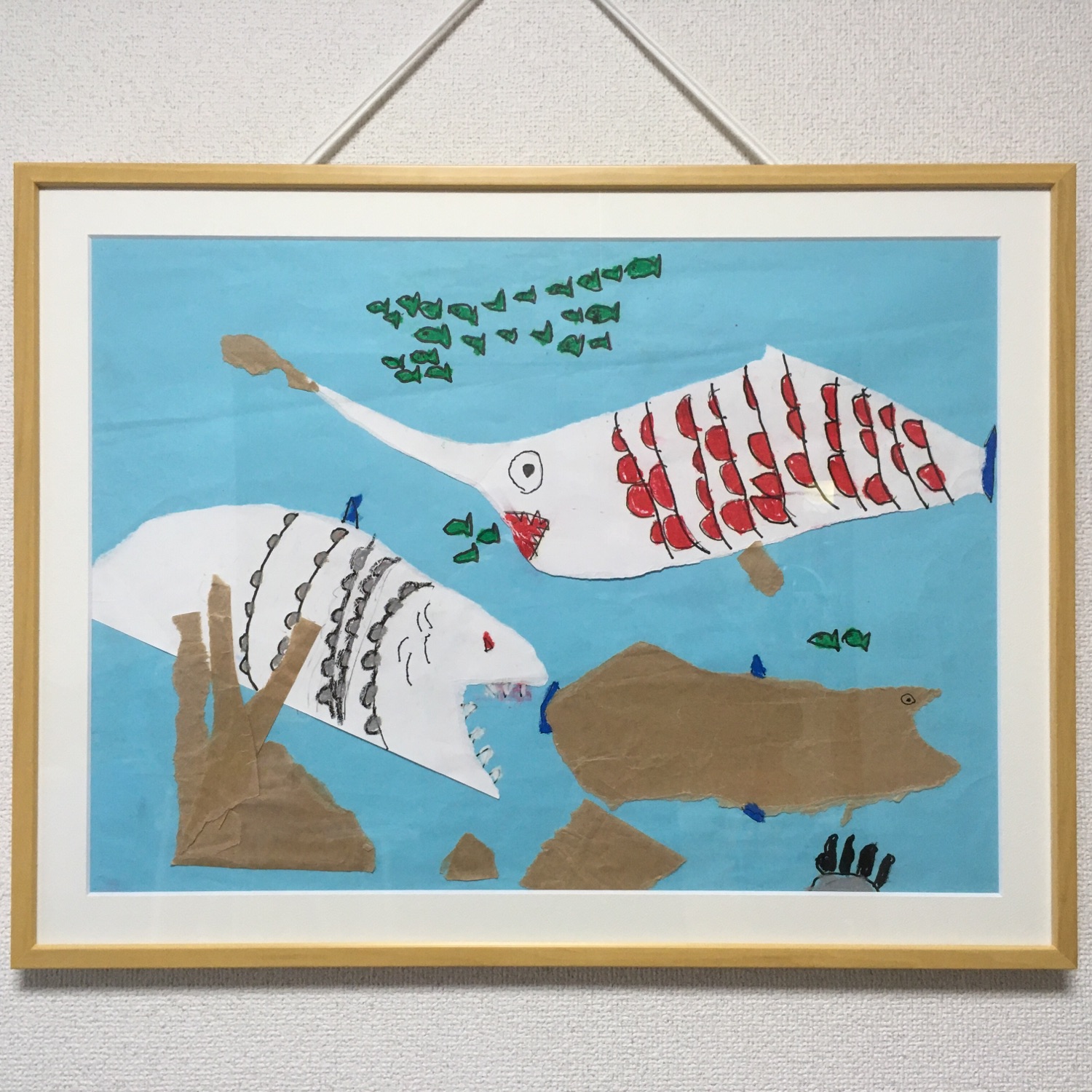海の中の様子でしょうか。獲物を追いかけて、今にも食いつこうとする姿に迫力があります…!また、まん丸な目をした魚の表情も可愛らしいです🥰ナチュラルなフレームも雰囲気にとても似合っていますね!こうして額装すると長く眺めることができて、この作品が出来た時の思い出も鮮明に思い出せそうです✨