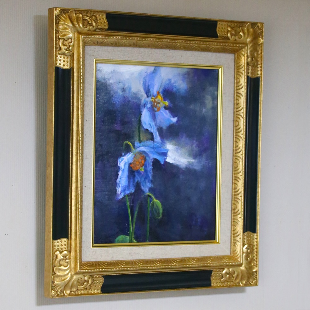 繊細で儚げなブルーの花がとても素敵です。額の色が強いかもしれませんが、メリハリがあって個人的には好みです✨青を基調とした作品なのでシルバーの額でも似合いそうです!🌸