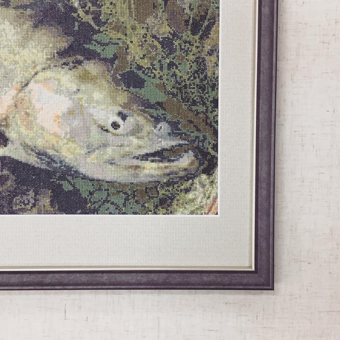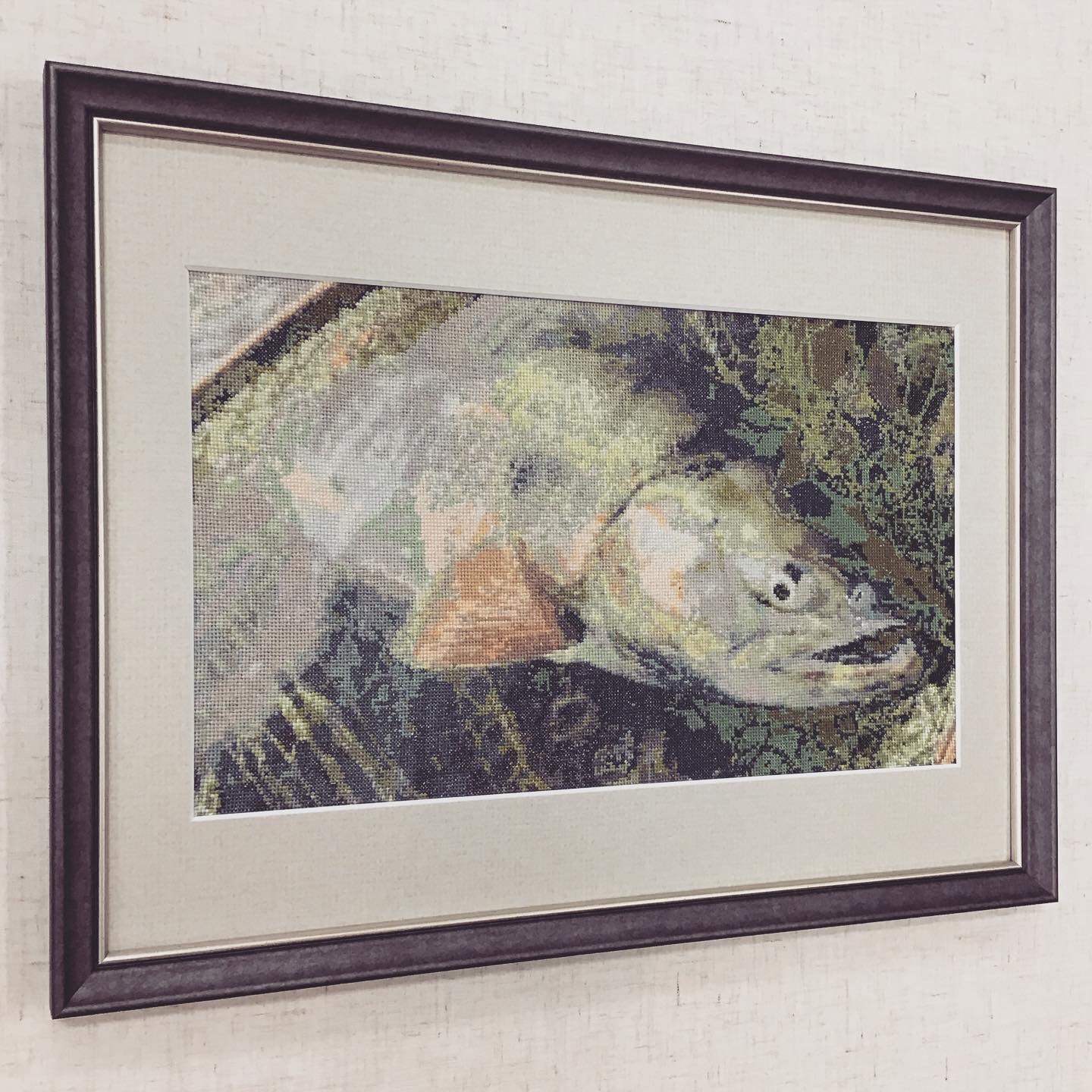 お客様が写真をもとに図案を考えたオリジナル刺繍作品を額装しました〜! 使用したフレームは「8229 ブラック」、マットは薄いグレー色のマットを使用しました! #額縁のタカハシ松本店 #額縁のタカハシ #額映え #額縁屋 #額縁店 #額装 #額縁 #額 #額縁アート #額縁職人 #刺繍 #刺しゅう #魚 #さかな