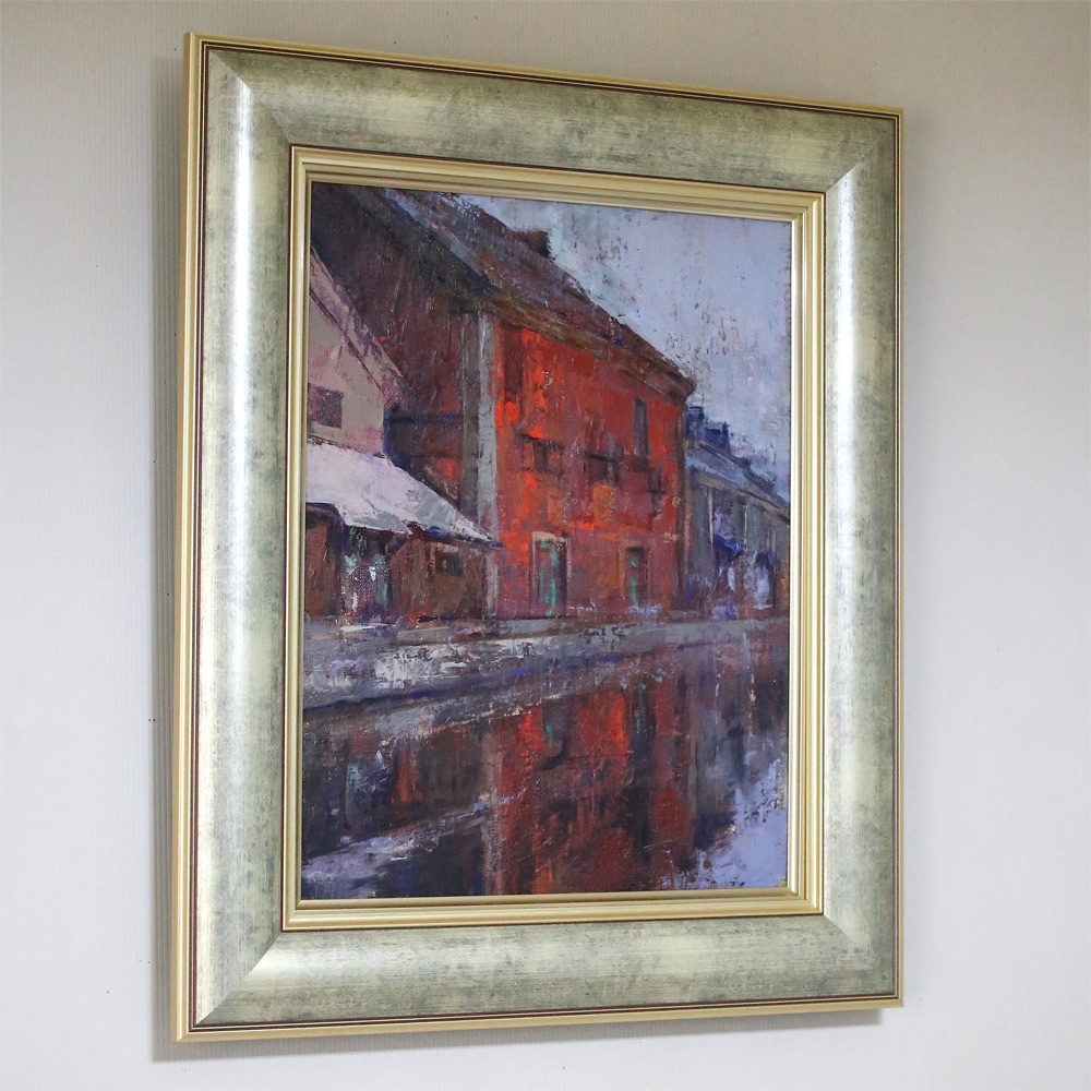 水面に映る建物がリアルでありながらも幻想的な作品です。赤い色が目を惹きますが落ち着いた色合いで描かれているので、今回のゴールドがよく馴染んでいます✨眺めているとほっとする組み合わせですね。