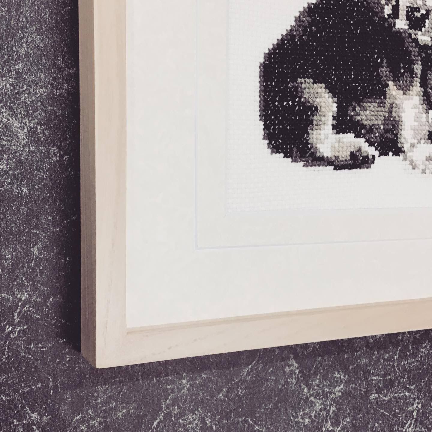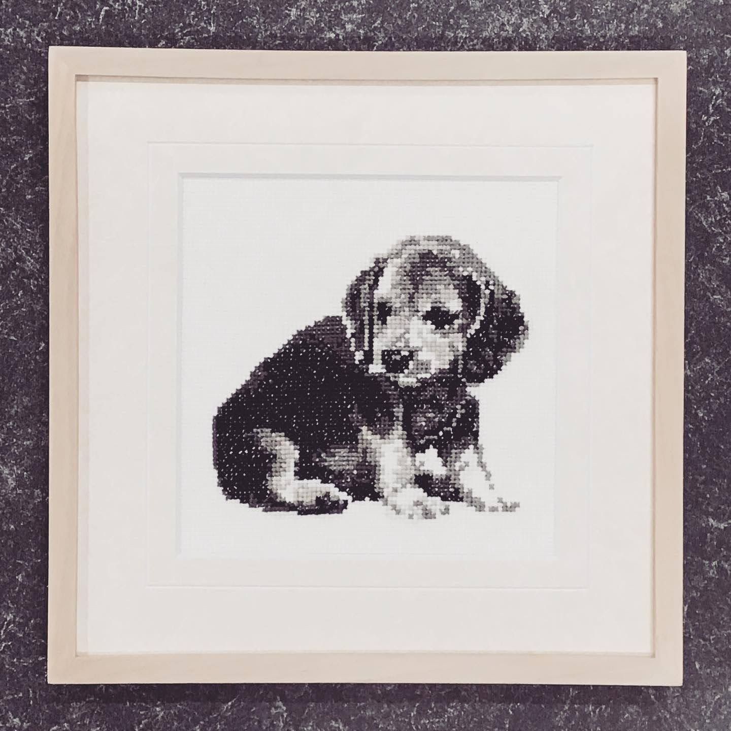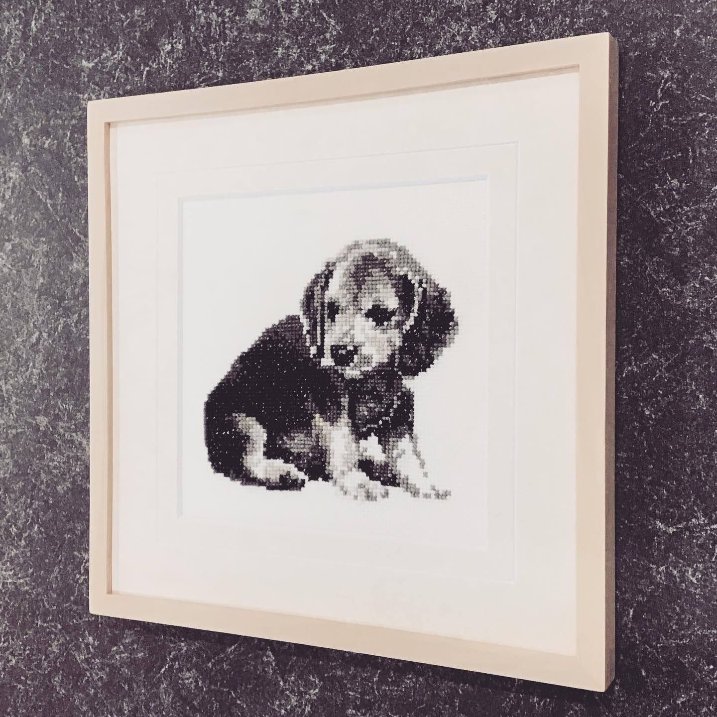 子犬のクロスステッチ刺繍を額装させていただきました。 25センチ角の小ぶりの額(9102乳白)を利用し、圧迫感のない色使いを心がけました。地模様のある優しいマット色を選んでいただいたので、アクセントで絵の周囲にシンプルなV溝を施してあります。 #額縁のタカハシ松本店 #クロス刺繍 #クロスステッチ #ビーグル #ビーグル犬 #子犬 #マットカット