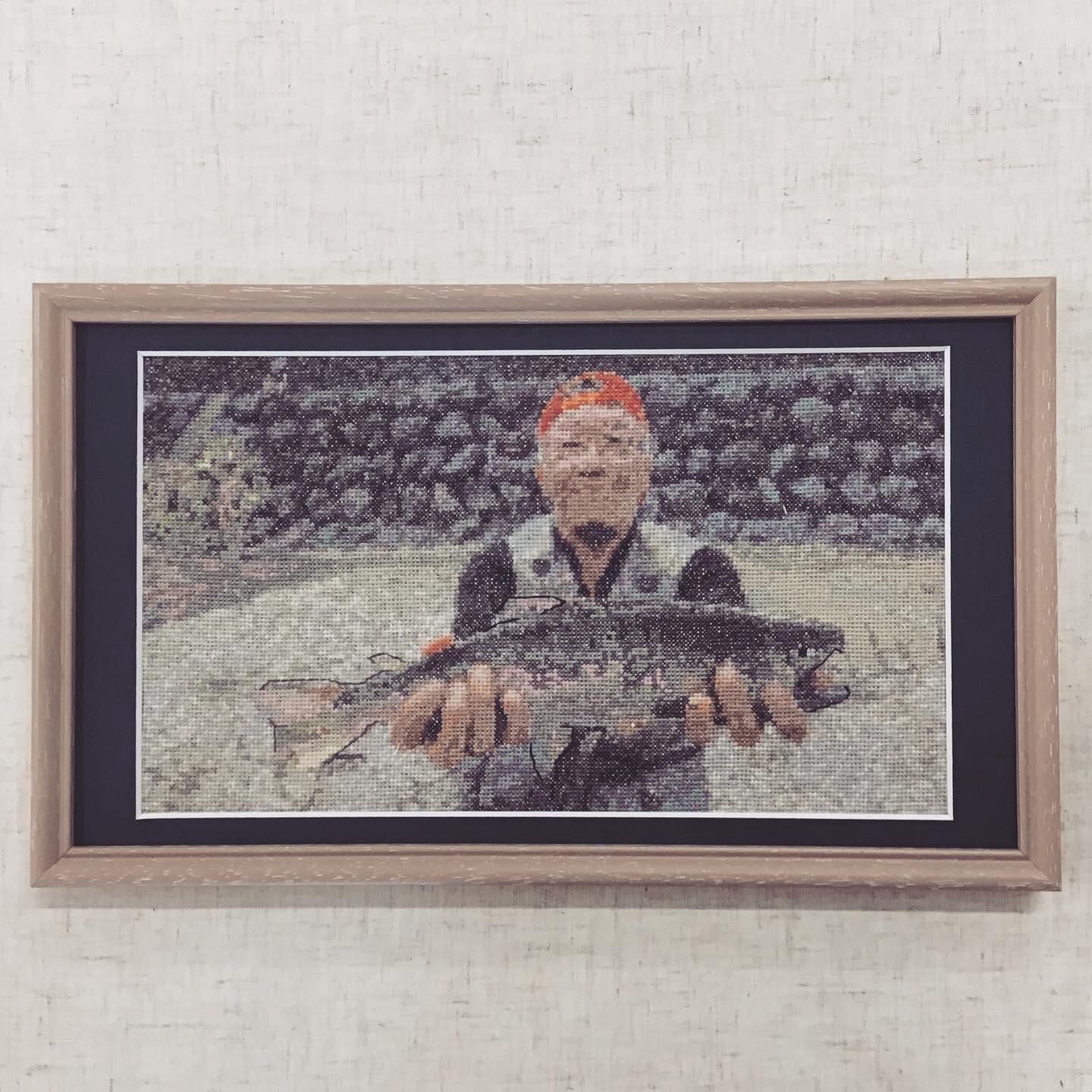 嬉しそうに魚を持っている男性...こちらは写真をもとにお客様が図案を考えたオリジナルの刺繍作品です!少し前に投稿した魚の刺繍作品と風景の刺繍作品と同じ作者です〜(^ ^) 使用したフレームは「6701 ピンク」、マットは紺色マットを使用しました! #額縁のタカハシ松本店 #額縁のタカハシ #額映え #額縁屋 #額縁店 #額装 #額縁 #額 #額縁アート #額縁職人 #刺繍 #刺しゅう #魚 #さかな