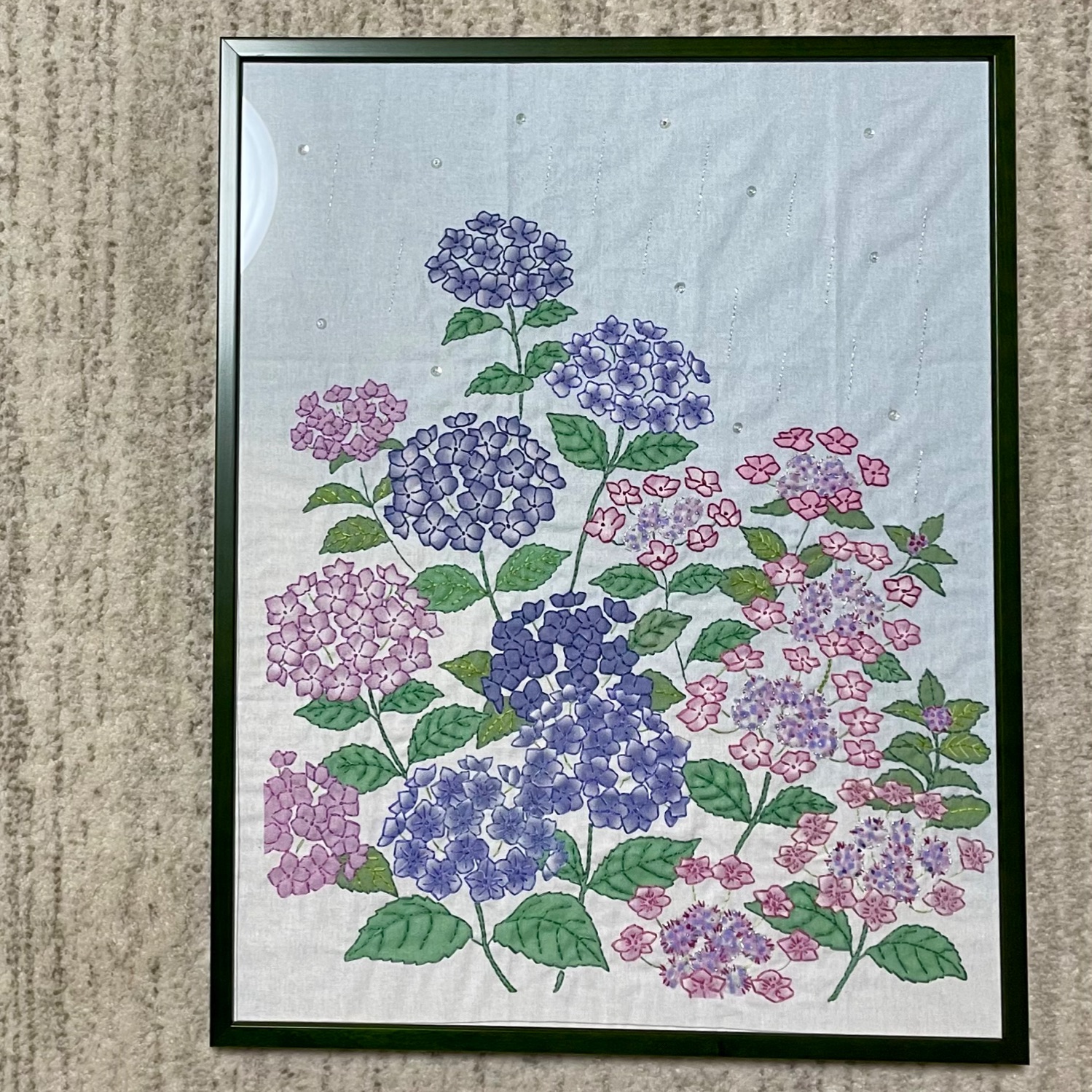 スパンコールで表現された雨がキラキラしていてとても素敵です☔「一般額5767Nグリーン」のナチュラルな木製フレームと、紫陽花の自然な様子がマッチしていますね。梅雨の時期に入る頃ですが、家の中で季節を感じられるのも良いですね✨