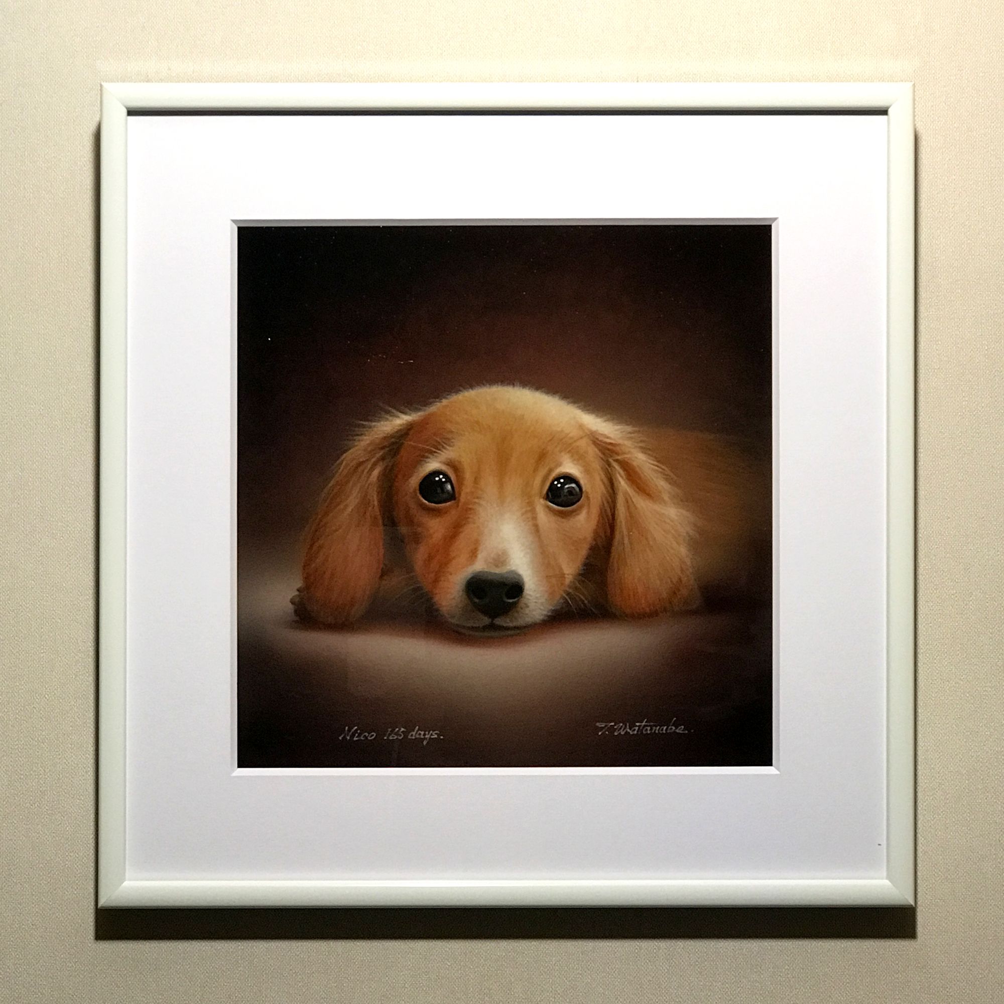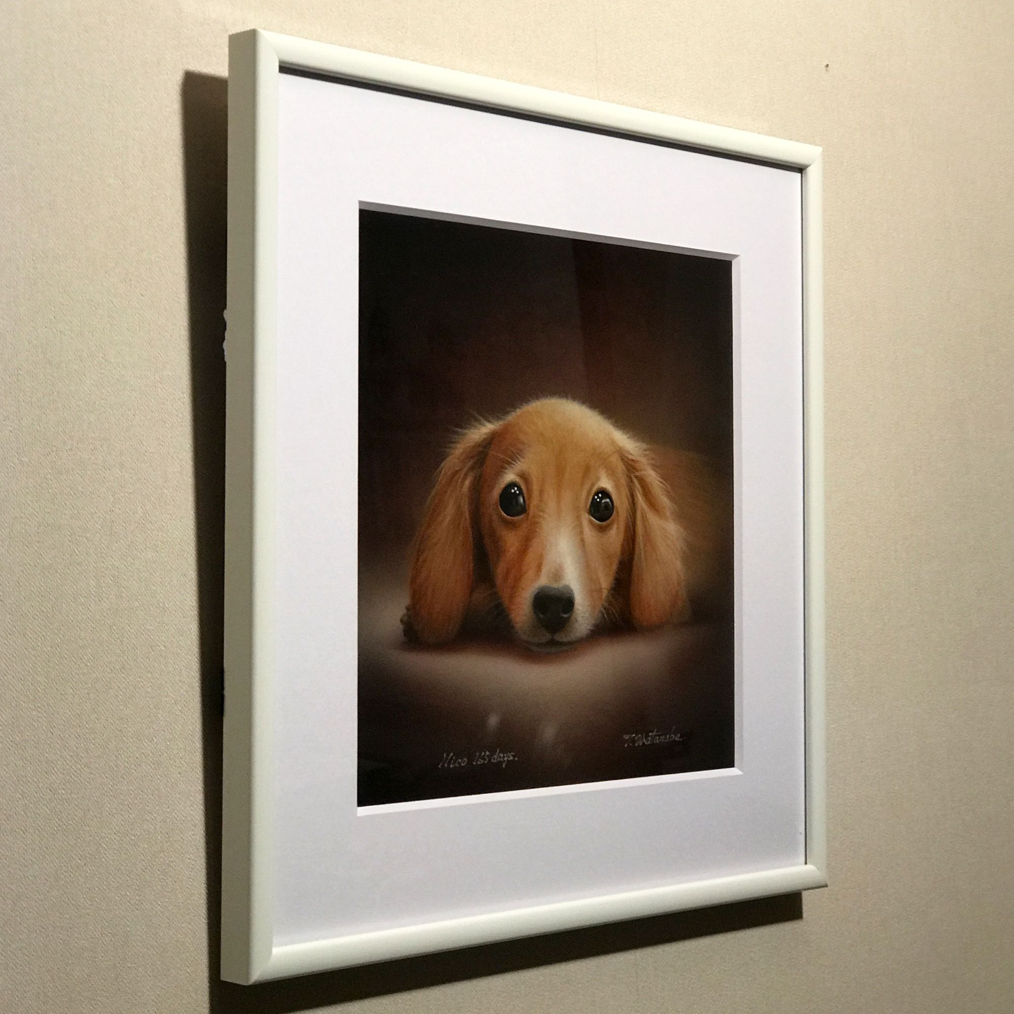 色は限られてしまいますが、3ミリ厚の額装マットを使用することで生まれる奥行きは魅力的です。シンプルに、それでいて作品を引き立たせる効果が出ます。本当にこちらを見ているようなつぶらな瞳に思わず目を奪われますね✨🐕