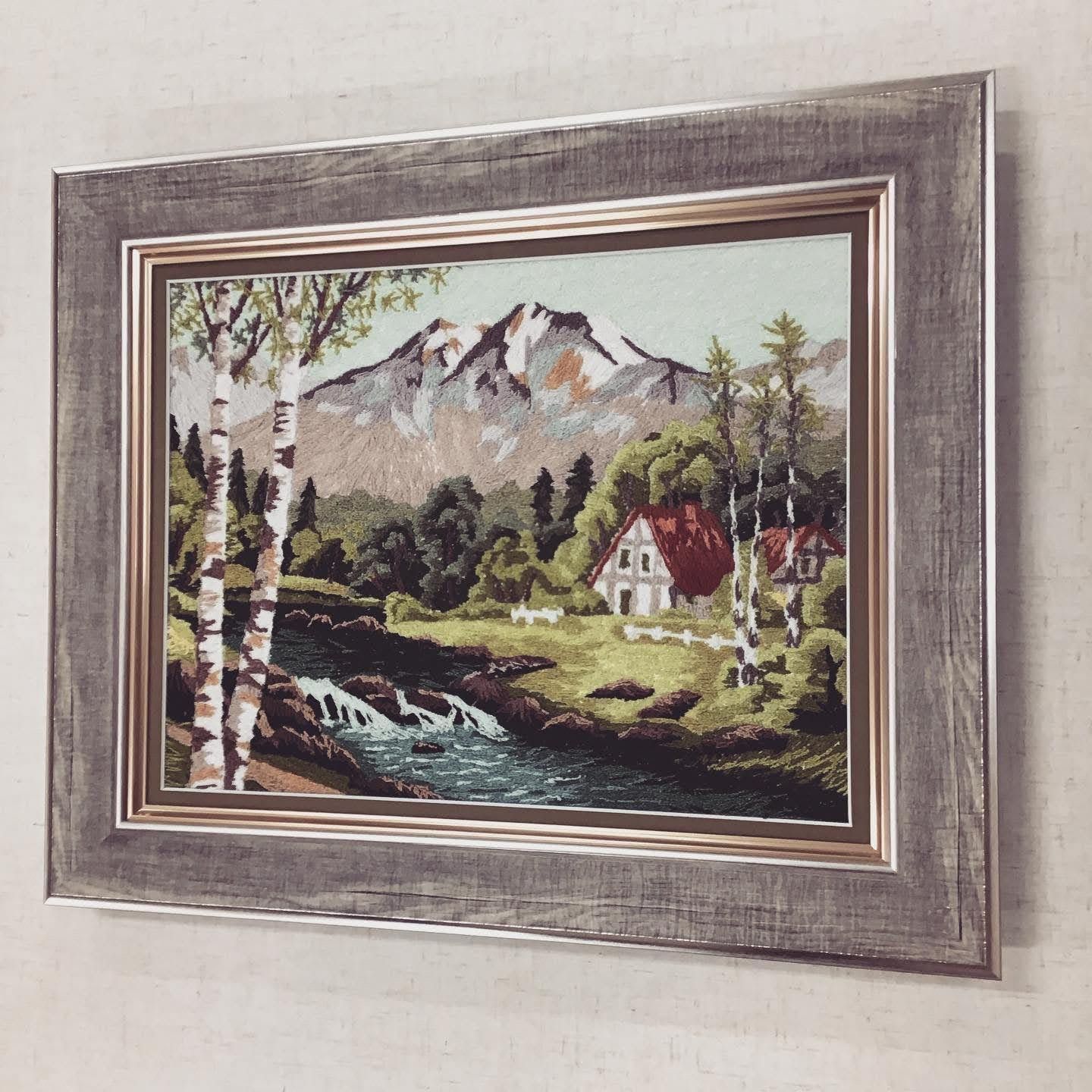 文化刺しゅうを額装いたしました。赤い屋根の小屋がとっても可愛らしいです。お客様がご自身で考えてアクセントに入れたとのことでした。和風の風物やテーマではないので、油彩画用の額縁(8163チャコール)を選択しました。マットで細く縁取りを入れることによって(マット19005紫)無難になりすぎず、メリハリも出てはっきりしました。ふっくらとした文化刺繍はボリュームが出るので、実は和額ではなく、洋額に入れたとしても見栄えがします。 #額縁のタカハシ松本店 #文化刺しゅう #文化刺繍 #風景