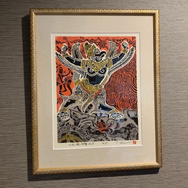 カンボジア国アンコール・ワットの第一回廊壁面にあるレリーフの拓本をモチーフにして木版画を制作しました。タイトルは「火焔と闘う神鷲ガルダ」。コルクのマットとゴールドの額縁で額装してみました。