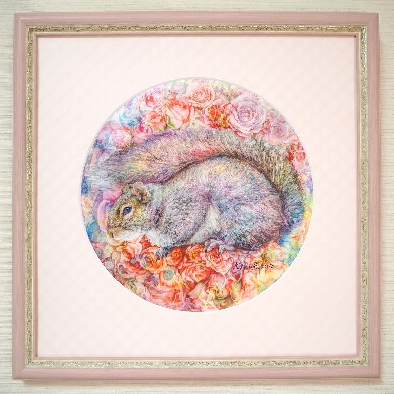 作品名:「りすのブーケ」 作家名: 瑞慶覧 かおり 技法/サイズ: フレスコ画/径24.8㎝ 一般額 APS-02 APS-02 アクリル付 /350×350(35角)/ピンク 額装マット /350×350(35角)/247×247/丸窓 ○/桃色格子20302
