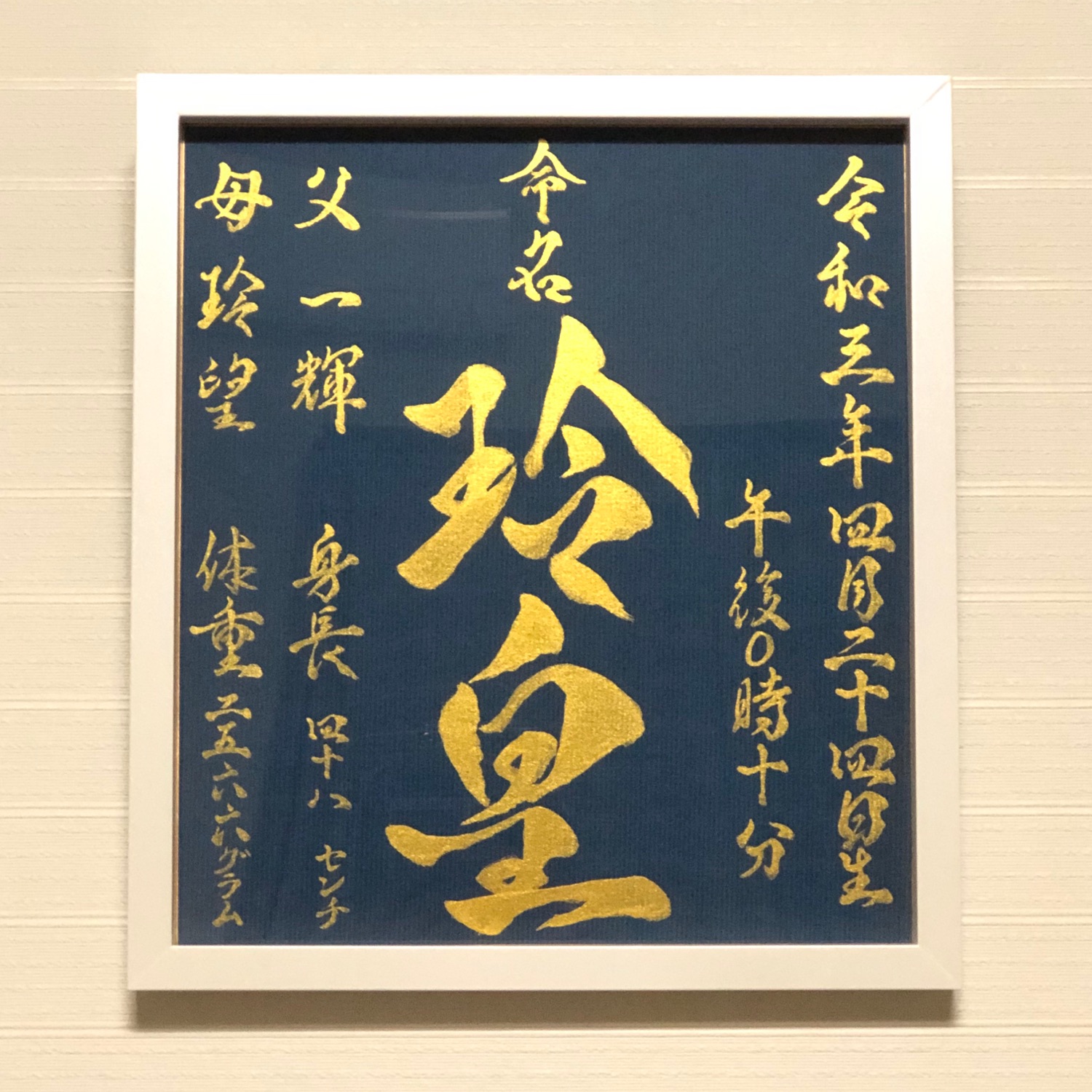 濃いめの色紙に金文字にて命名書! 大きなフレームなど色々ありますが、 やはりこちらの額縁を選んでいただきました!