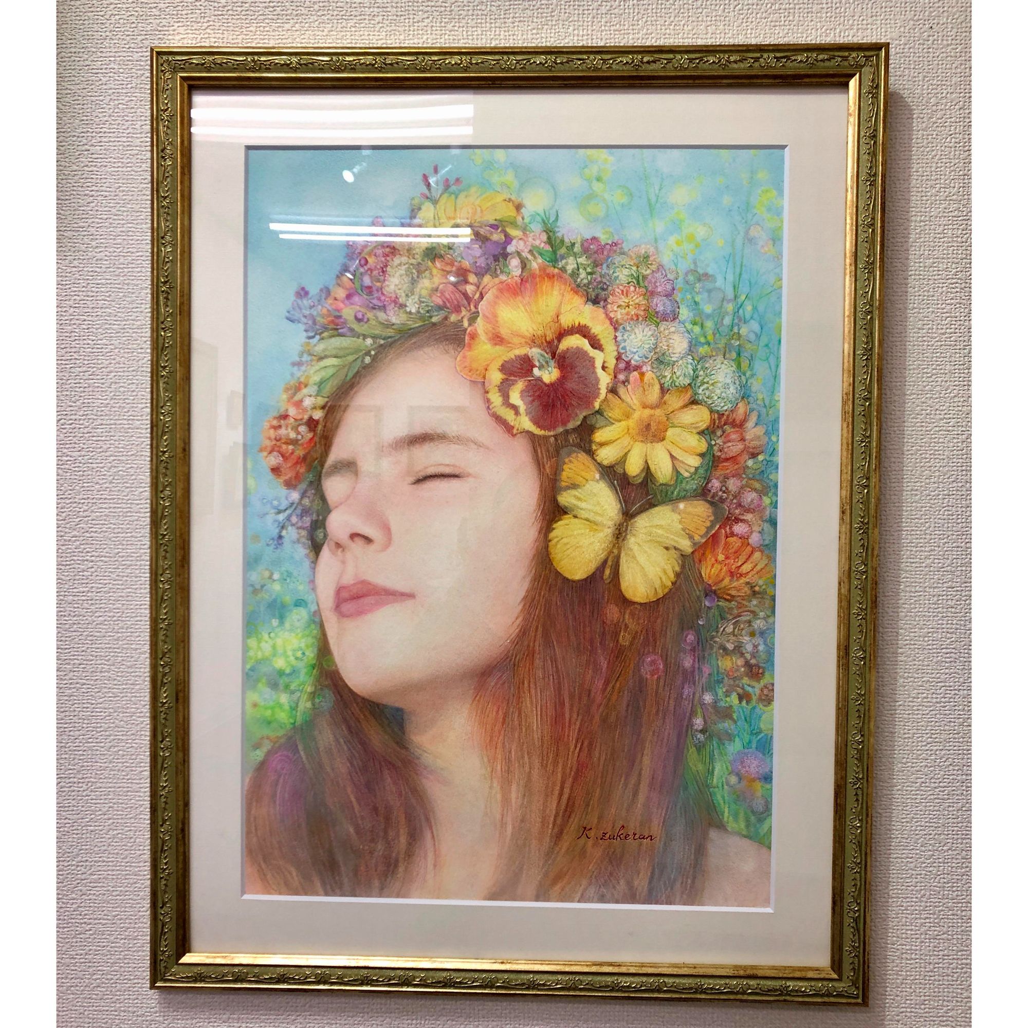 作品名:「花冠」 作家名: 瑞慶覧 かおり 技法/サイズ: フレスコ画/51.5×36.4㎝(B3) 並マット /マット色:ワーグマン10043/額縁内寸法:455×606(三々)の額縁用