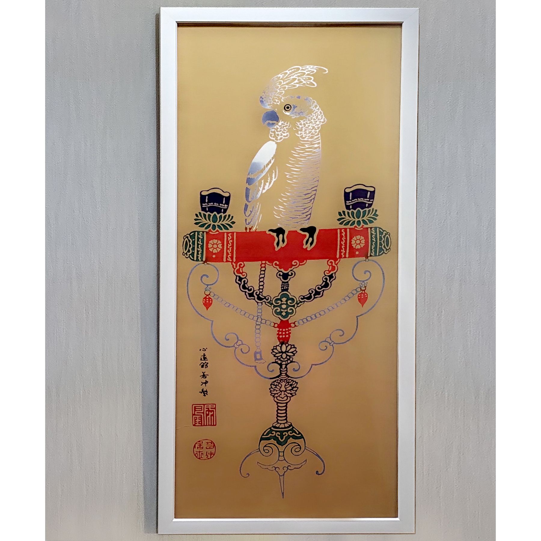 伊藤若冲の「鸚鵡図」の手ぬぐいを額装しました。 フレームの色でかなり迷いましたが、すっきりとした太目の白のフレームで正解でした。 中身が手ぬぐいとは思えないくらい良く見え、和洋どちらの部屋にも似合うので、大満足です。