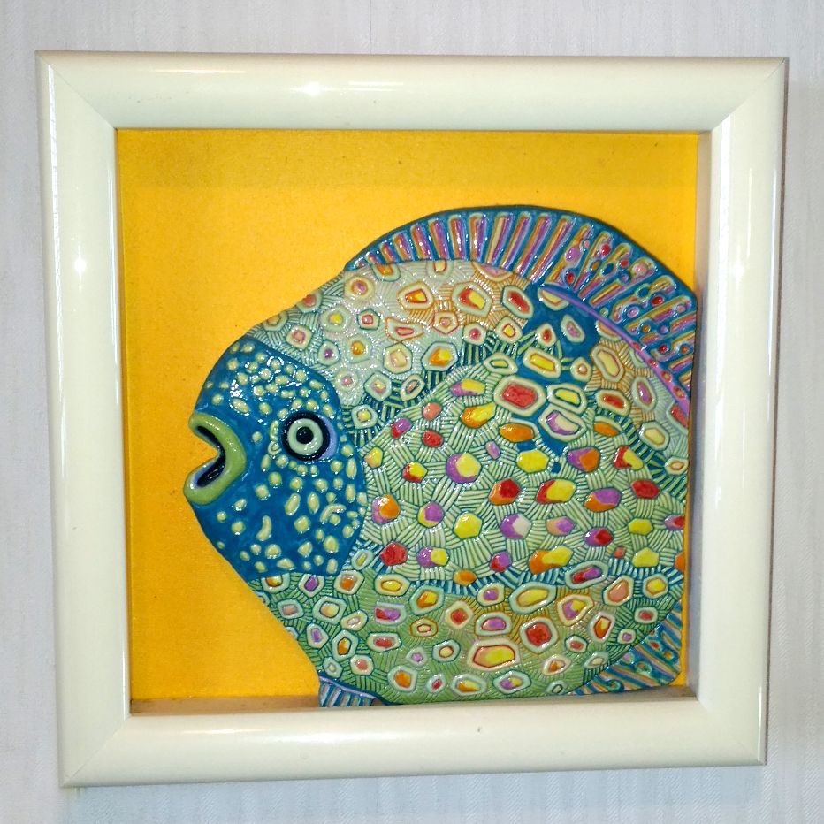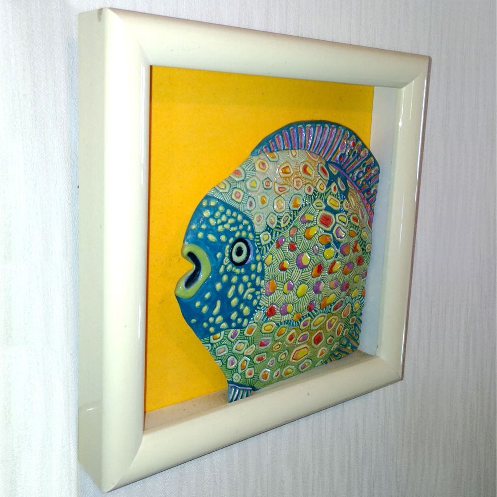 陶芸で作った作品を自分で額装しました。 HERMESのカレ「Grands Fonds Ⅱ 2002」をデフォルメして陶器で立体的に仕上げています。