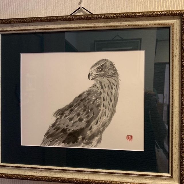 水墨画で鷹を描いてみました。額縁のタカハシさんに頼むと素敵に仕上がってきます。いつもありがとうございます。