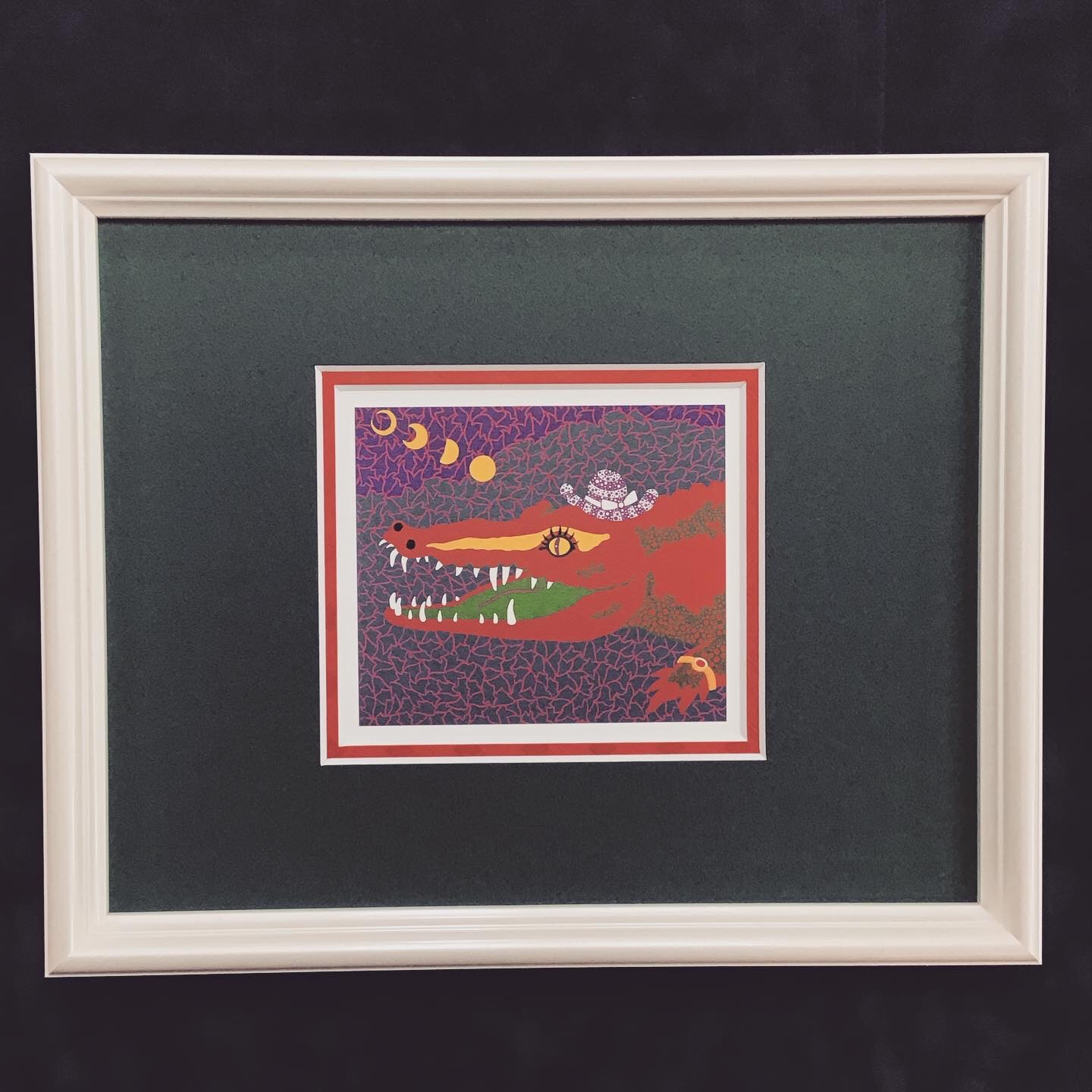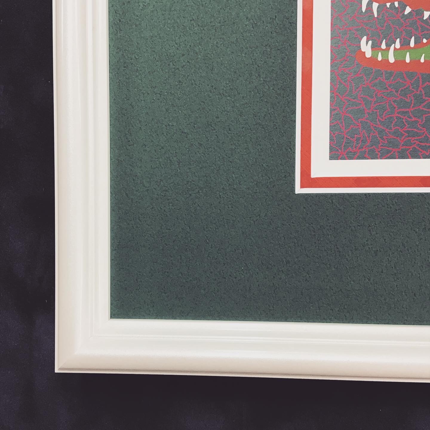 草間彌生「鰐」のポストカードを額装しました! 大胆な色使いの作品に合わせて、マットも大胆に緑と赤のダブルマットにしてみました!濃い色のマットを使用すると作品がマットの色に負けてしまうことがありますが...今回は不思議と作品とマットがマッチしましたね! #額縁のタカハシ松本店 #額縁のタカハシ #額映え #額縁屋 #額縁店 #額装 #額縁 #額 #額縁アート #額縁職人 #ポストカード #ダブルマット #草間彌生 #くさまやよい #鰐 #わに