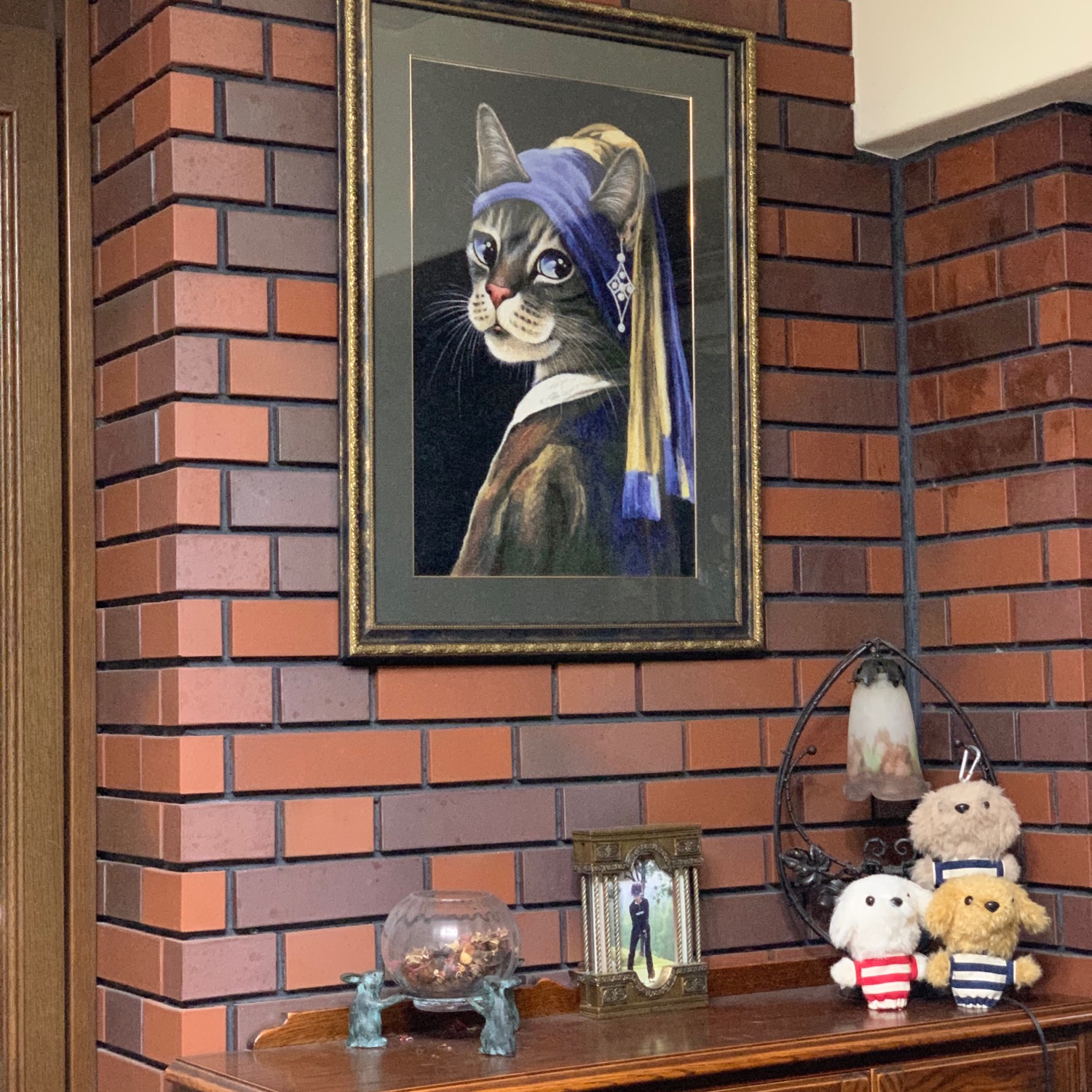 フェルメールの青いターバンの少女の猫パロディの刺繍です。13か月かかって仕上げました。