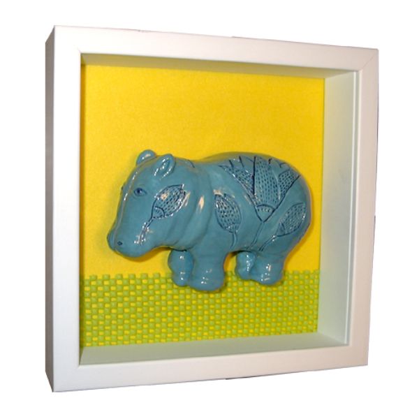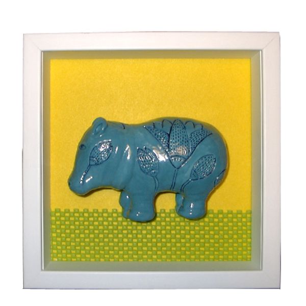陶芸で作った作品を自分で額装しました。 メトロポリタンミュージアムのマスコットのカバ「ウイリアム」をデフォルメして陶器で立体的に仕上げています。