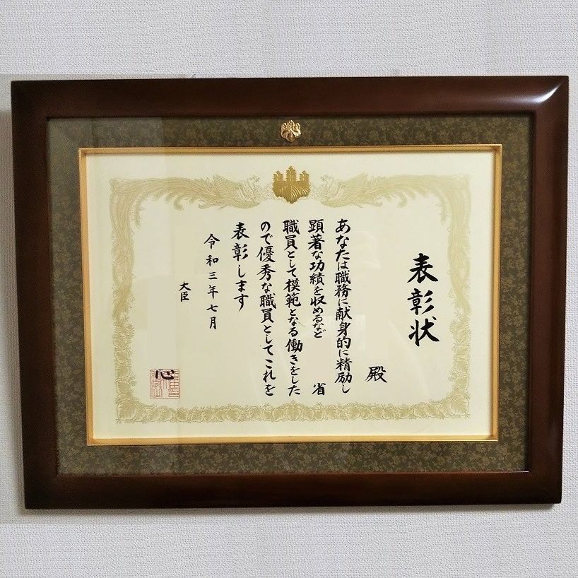 大臣から表彰状を頂いたため、思い切って額も豪華なものを選びました。五七桐の紋章が重厚感を引き立ててくれます。