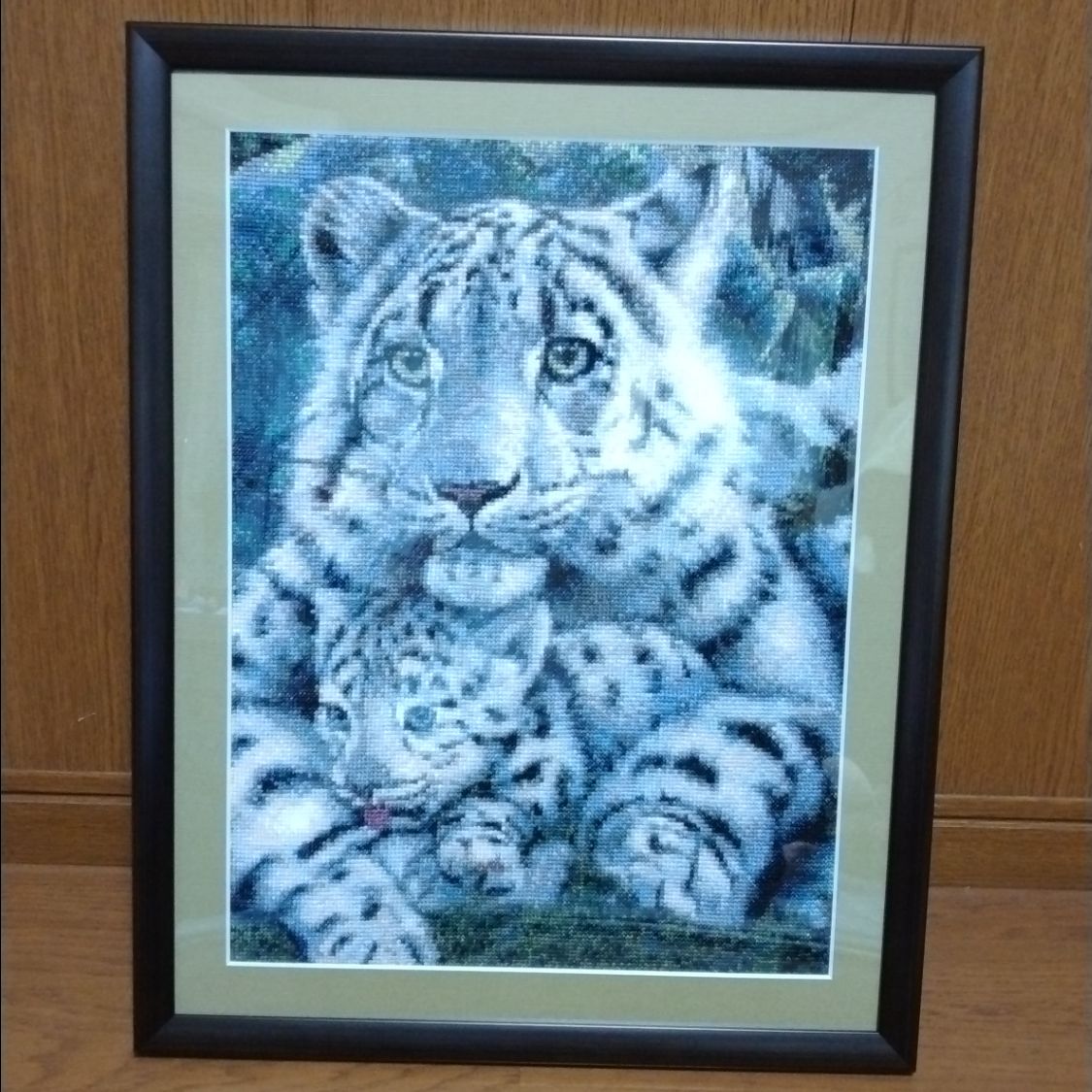 ホワイトタイガーの親子を刺繍しました。お母さんがしっかりと子どもを守っている姿がなんとも愛おしく この絵柄を選びました。額は黒色でマットは草原の緑がいいかなと選んでみました。凛々しい姿になったかなと思います。