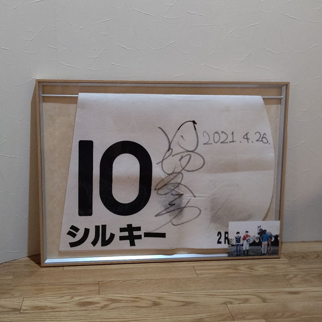 一口馬主での命名応募採用馬の初勝利ゼッケンをいただいたので購入してみました。 やはりしっかりした額に入るとまた1段カッコ良さが増しますね。 これから妻と飾る場所を相談します。