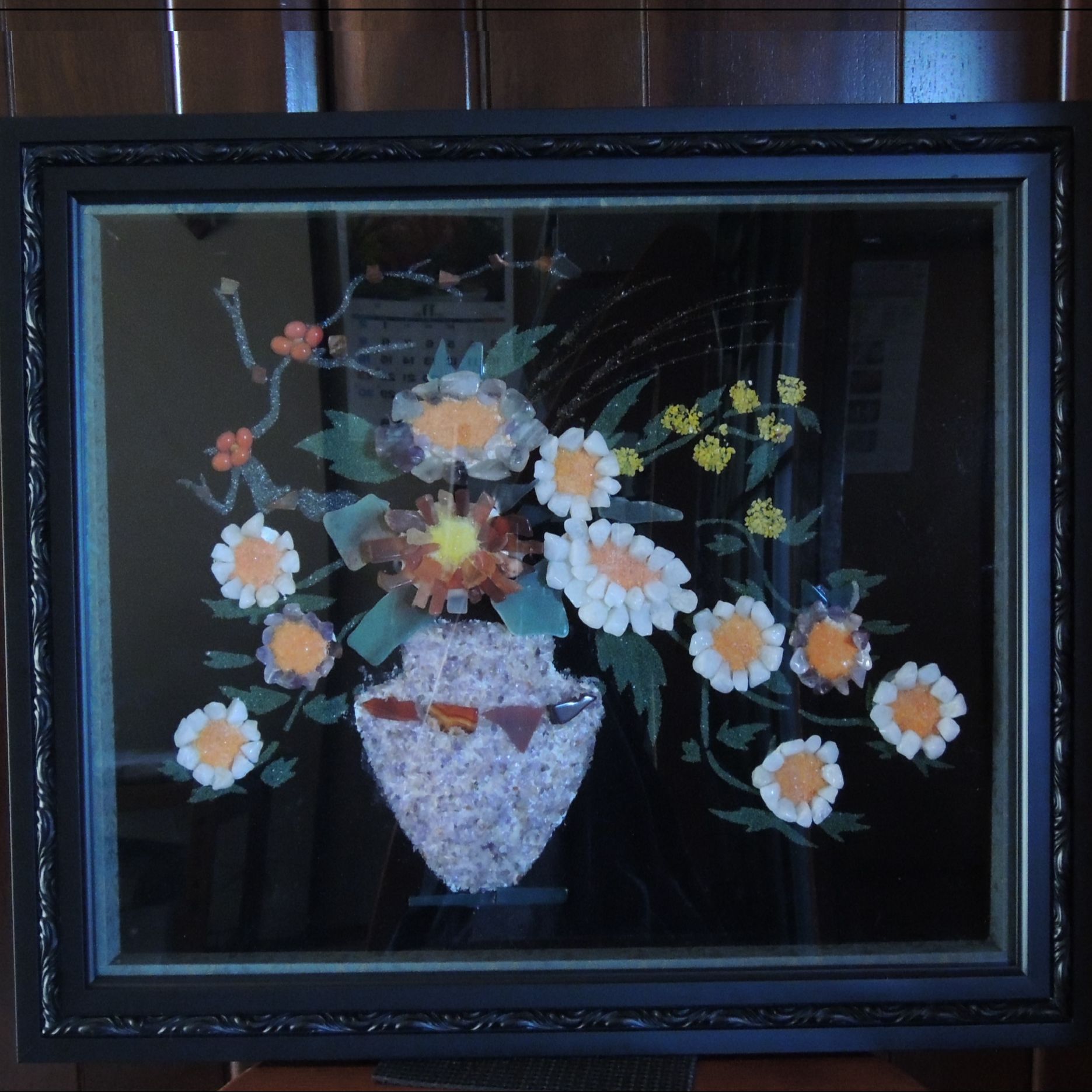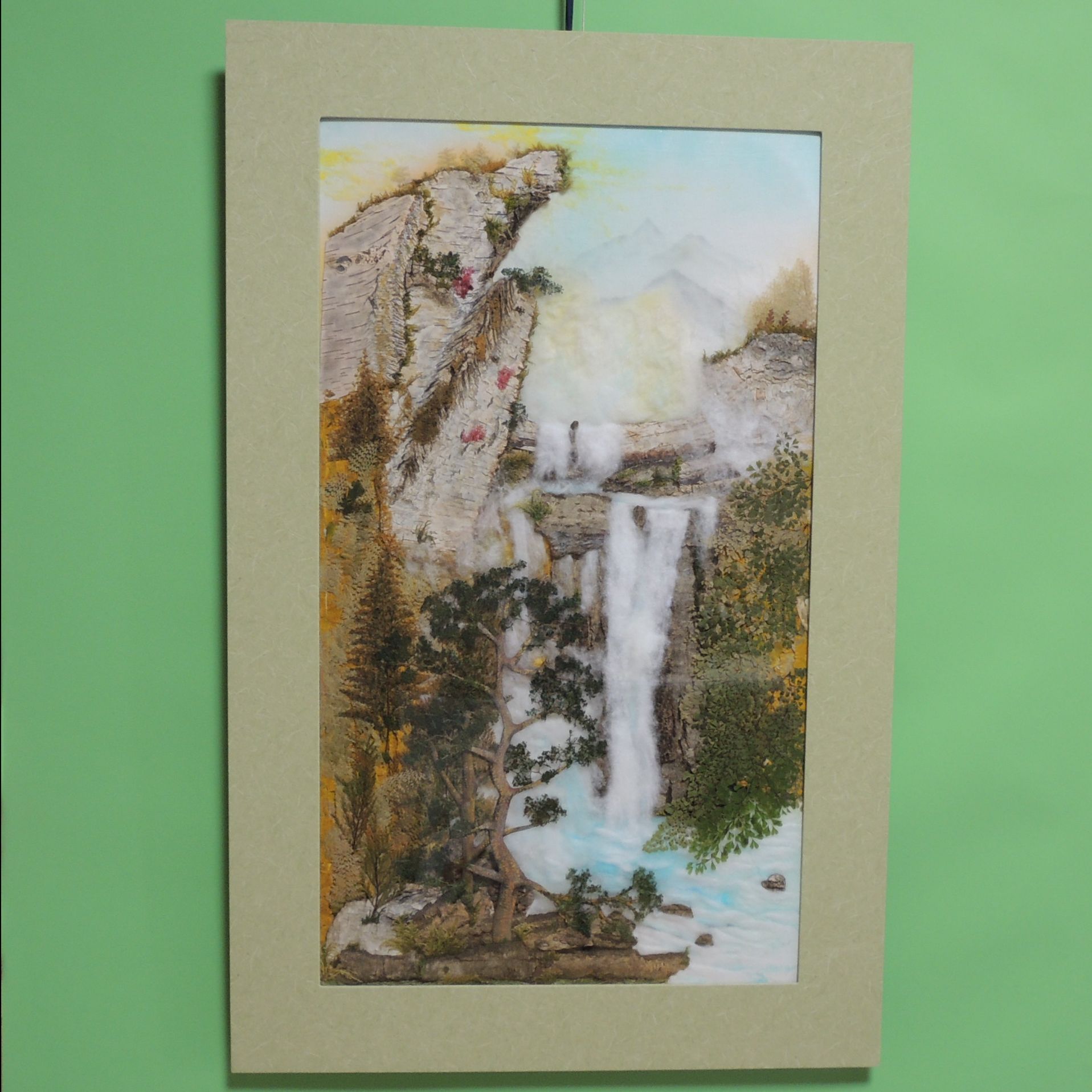 左側の画像 花瓶の花(貝殻を使用) 額縁:B-20154(321×410/20/7080)mm どんす渋青緑 右側の画像 瀧山水(押し花) 額縁:モダンパネル千草70 抹茶/701×402(mm)