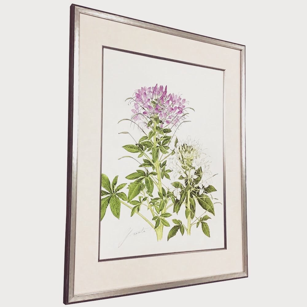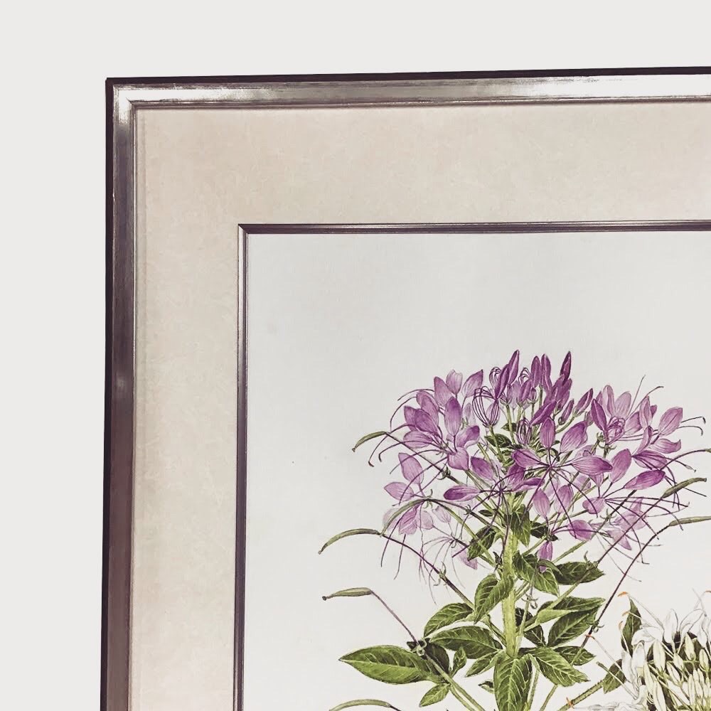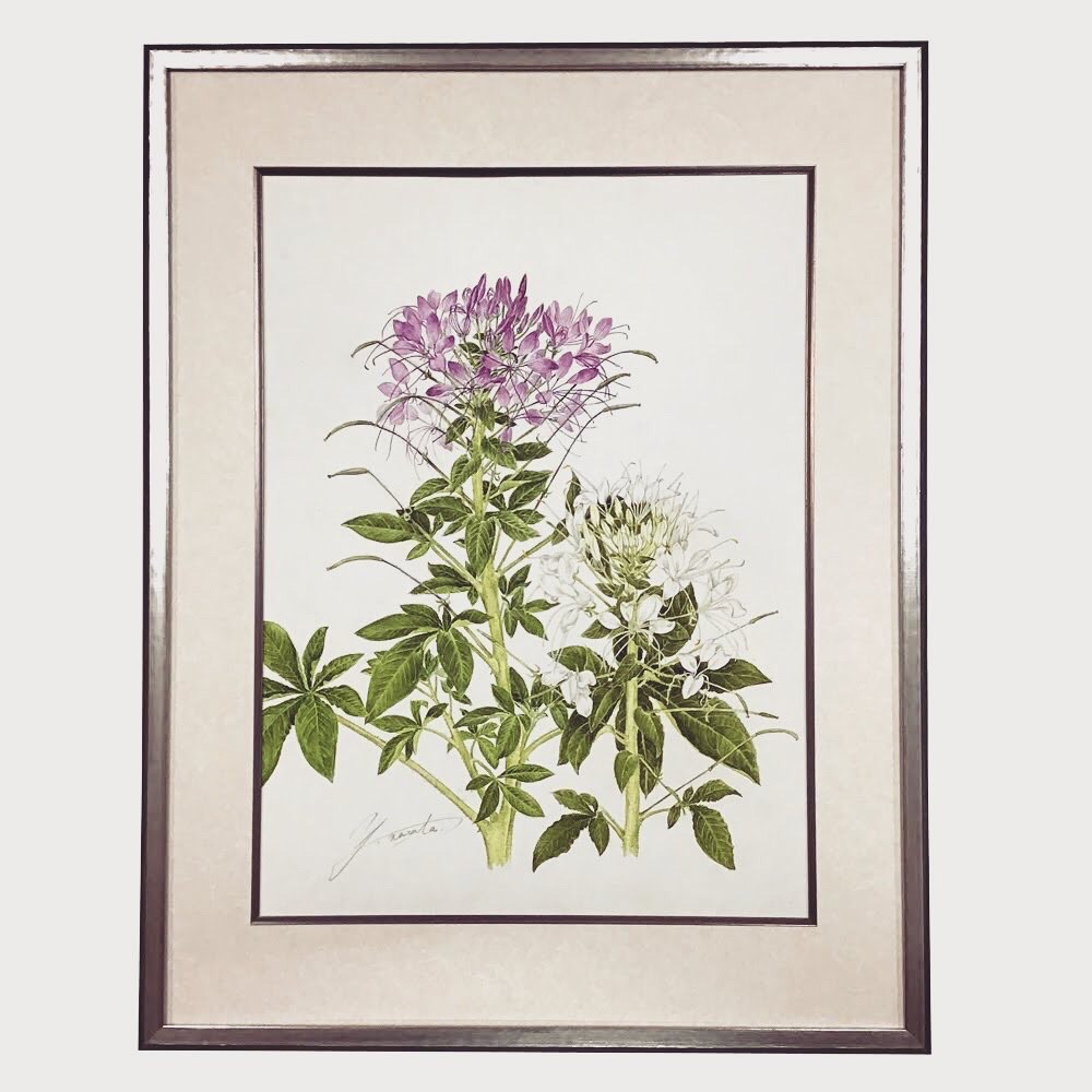ボタニカルアートを額装しました! 使用したフレームは「朱雀 黒S 小全紙」、マットは少し模様のある白色マットに面金加工(銀)をしました!シンプルですがオシャレな額装になったと思います! #額縁のタカハシ松本店 #額縁のタカハシ #額映え #額縁屋 #額縁店 #額装 #額縁 #額 #額縁アート #額縁職人 #水彩画 #ボタニカルアート #はな #花