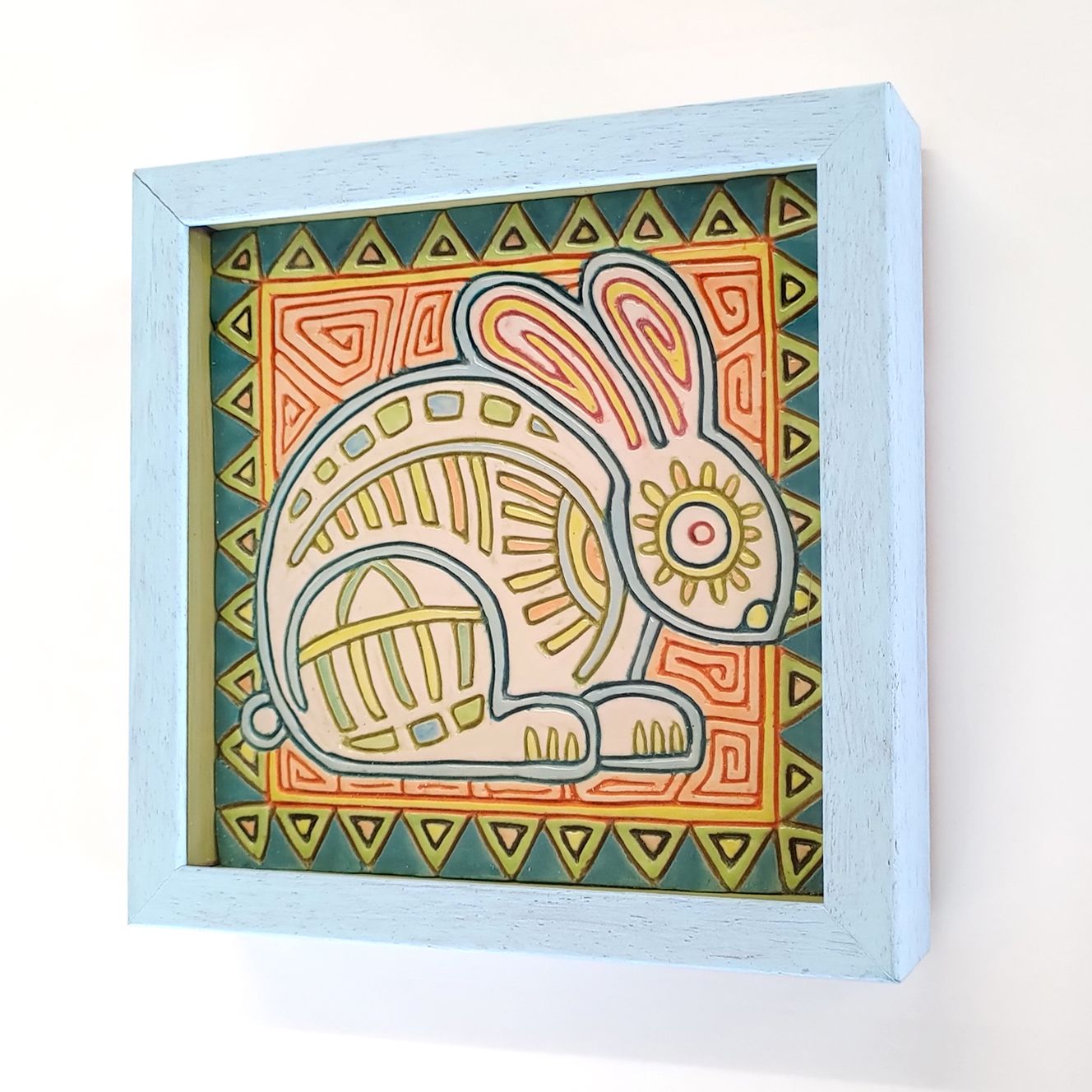 陶芸で作った四角プレート(陶板)を額装しました。 Mola(モラ)の模様をヒントに、シリーズで作陶しています。 🐇🦐🐤🐟️ 動物や植物を独特にデフォルメした模様と色合いが気に入っています。