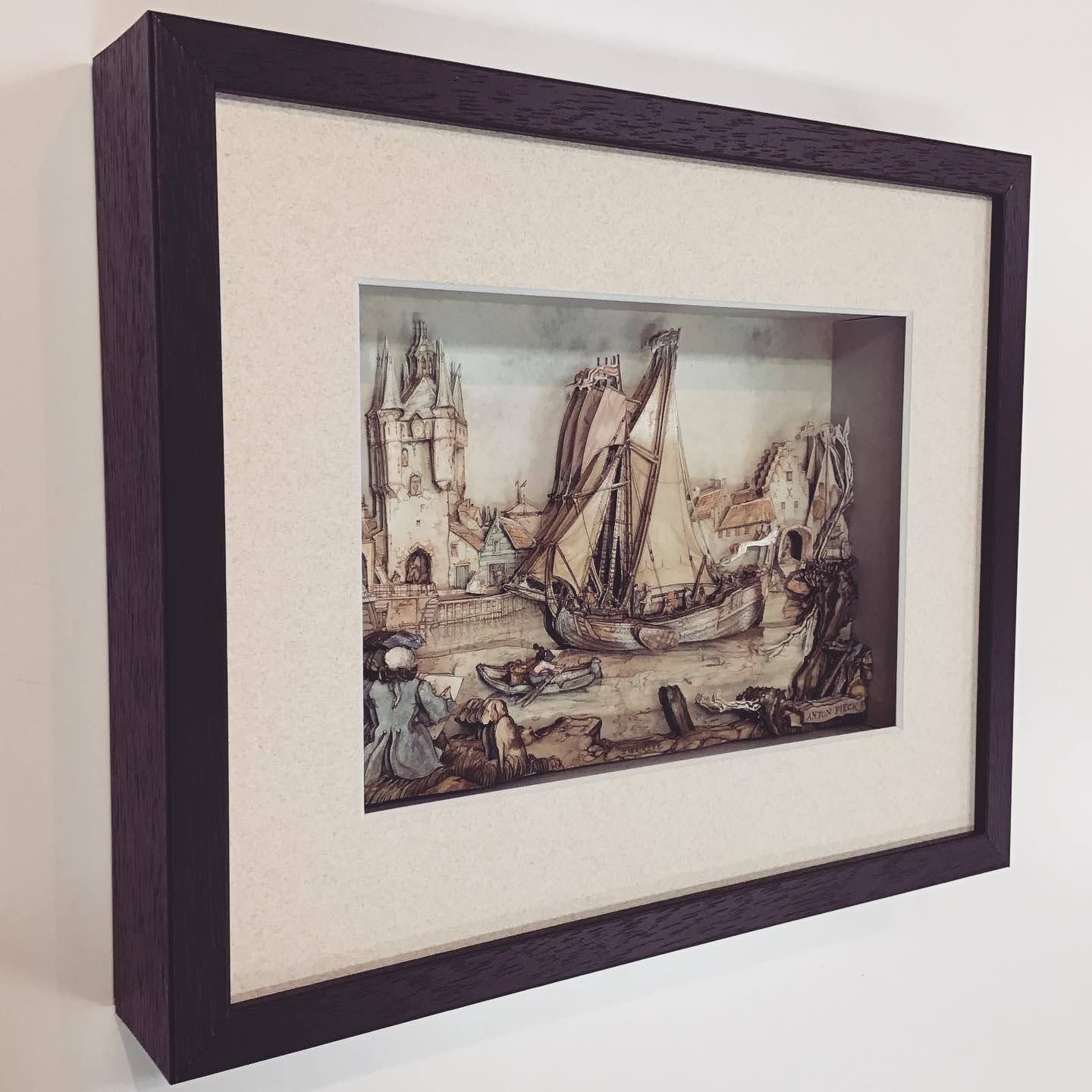 写真の2L大の大きさのシャドウボックスアートを額装いたしました。完成度の高さに毎度見とれてしまうアートの一つです。奥行のある既製額アートボックスフレーム(深さ39mm)のオーク色を使いました。 シャドウボックスは手が込んでいるほど奥行き間があります。マットの向こう側の奥まった部分ができるだけ暗く狭く見えないように、背景色と釣り合いを考えて選んだ色の柱を作品のキワに立てます。丁度良く背景とほとんど同じ色のマット色があり柱に利用できました。 #額縁のタカハシ松本店 #額縁のタカハシ #額映え #額縁屋 #額縁店 #額装 #額縁 #額 #額縁アート #額縁職人 #刺しゅう #刺繍 #シャドウボックス #風景 #舟 #船出