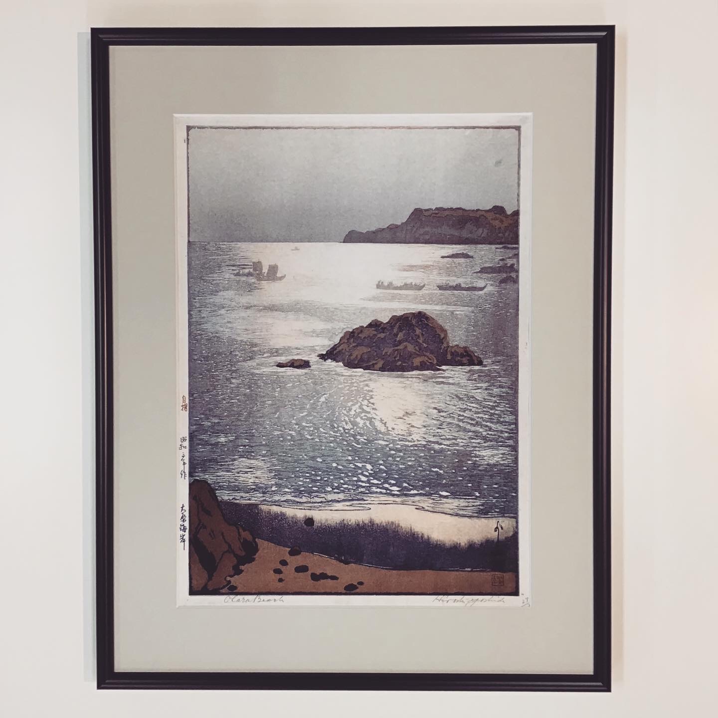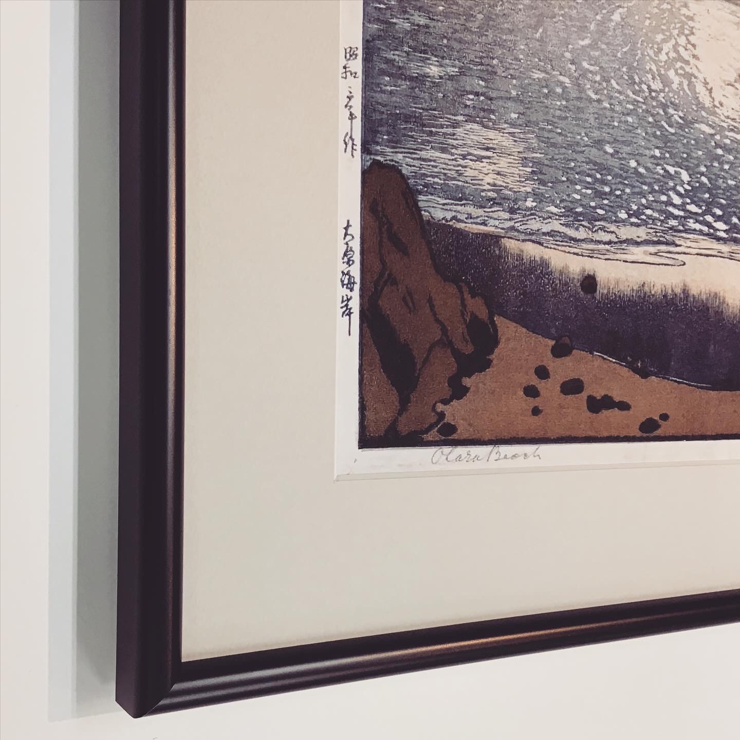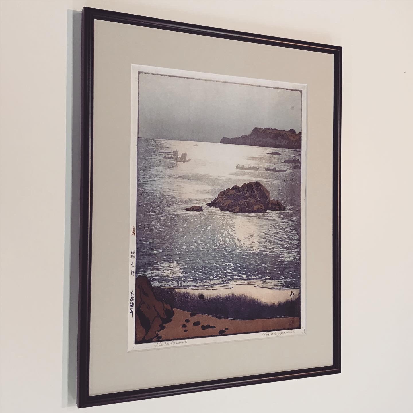 浮世絵「吉田博 大原海岸」の複製画を額装しました! 原画の色合いに限りなく近い色で印刷された複製画で、とても綺麗な色彩です。 黒色のフレームにマットはグレーのマットを使用しました。 #額縁のタカハシ松本店 #額縁のタカハシ #額映え #額縁屋 #額縁店 #額装 #額縁 #額 #額縁アート #額縁職人 #浮世絵 #複製