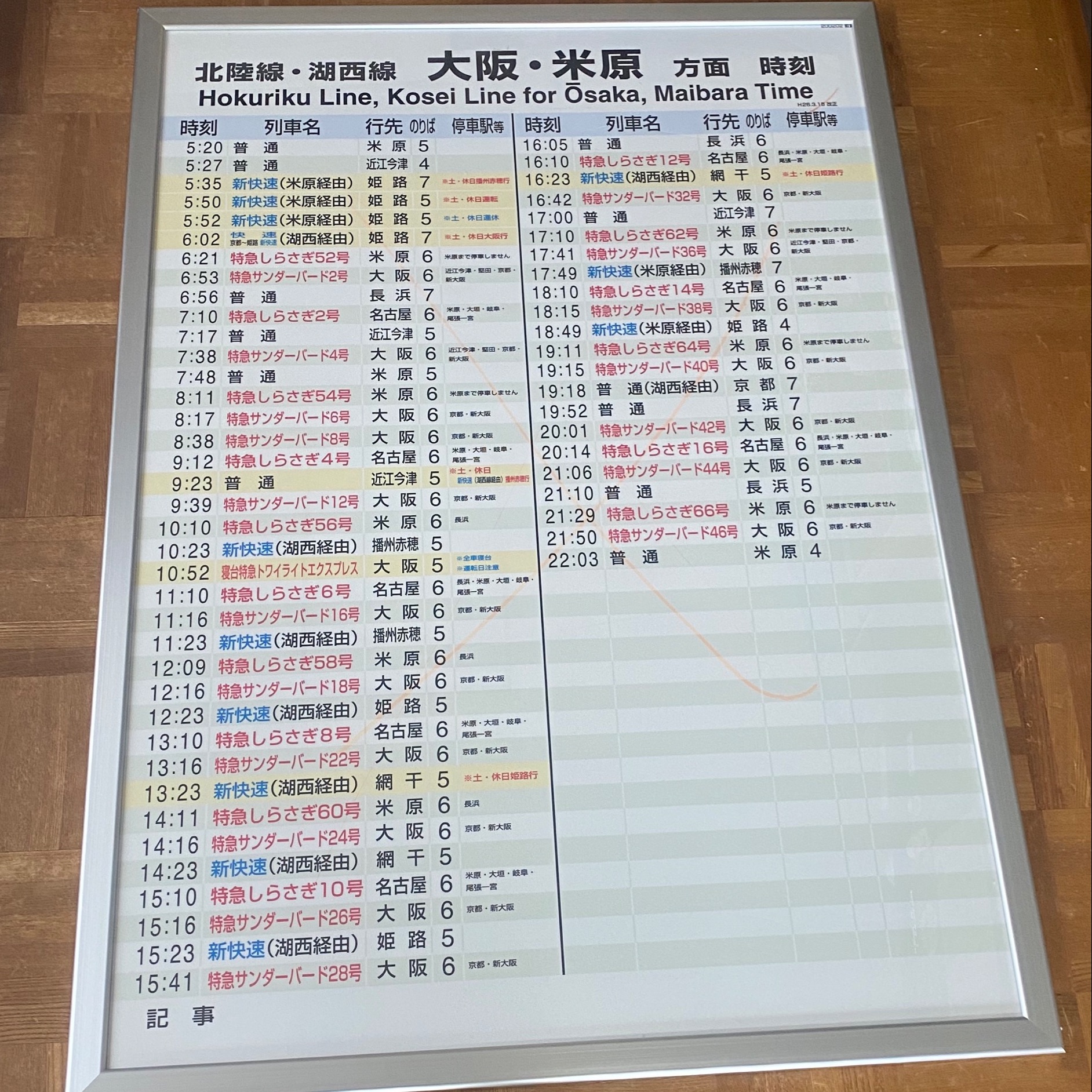 2002年の敦賀駅の時刻表です。今となっては、珍しいトワイライトエキスプレスの 列車名も見る事ができます。