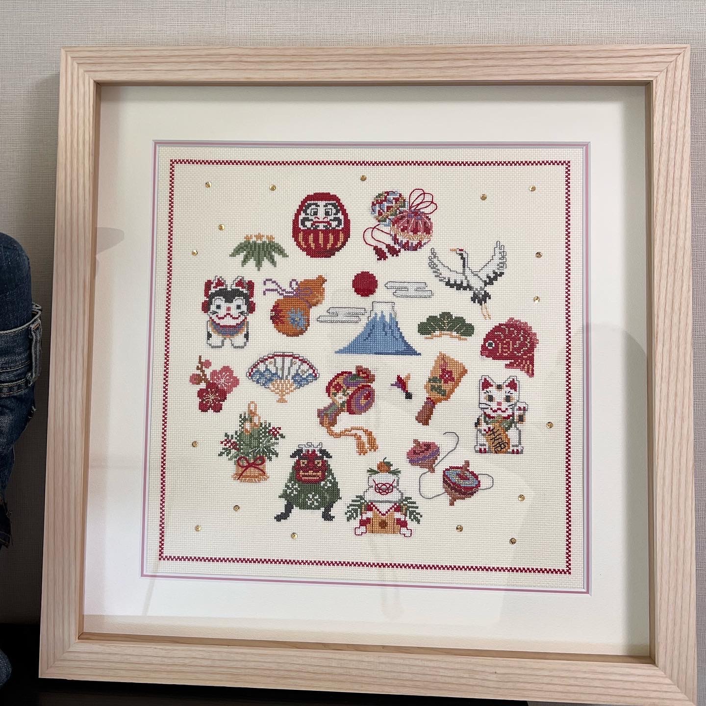 ホビーラホビーレの刺繍キットで刺繍したものを、額装してもらいました。もともとはタペストリーに仕立てるものでしたが、タペストリーだと飾りにくかったので。