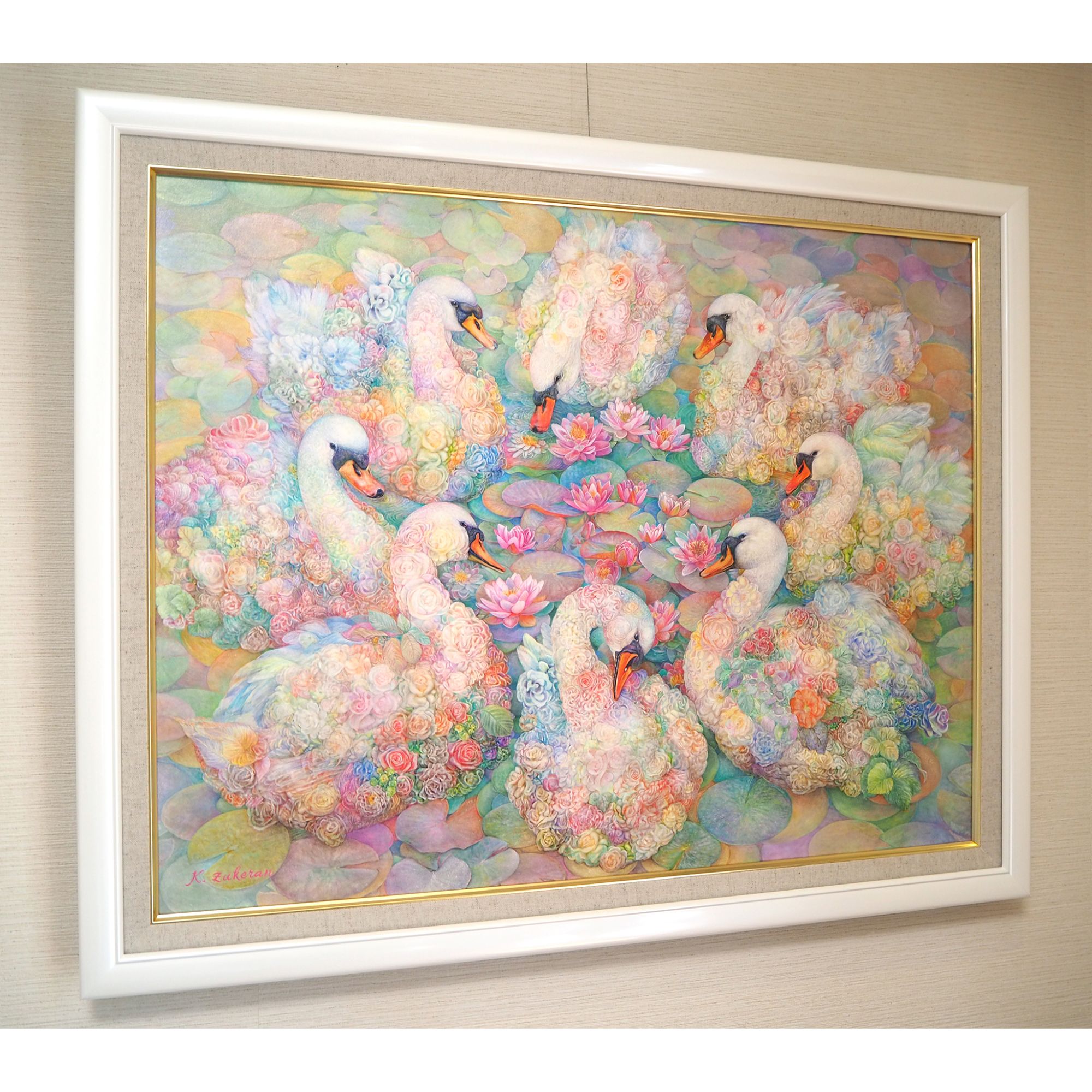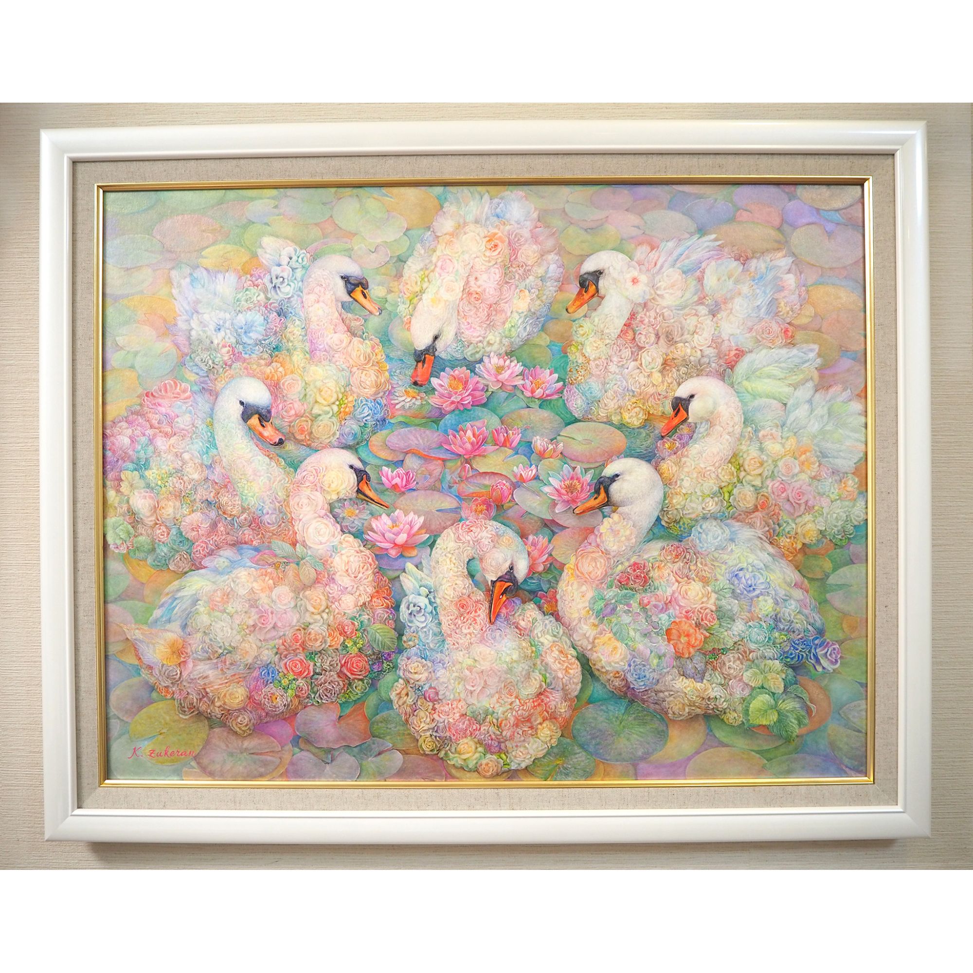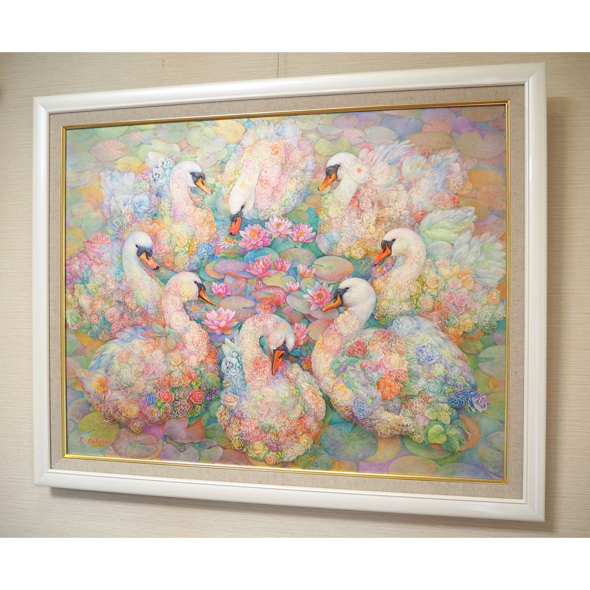 作品名:「水鳥の花環」 作家名: 瑞慶覧 かおり 技法/サイズ: フレスコ画 木製パネル/567×727/特注サイズ DG-5590 Pホワイト/567 × 727/21/麻ライナー金/アクリル付/かぶせ箱付