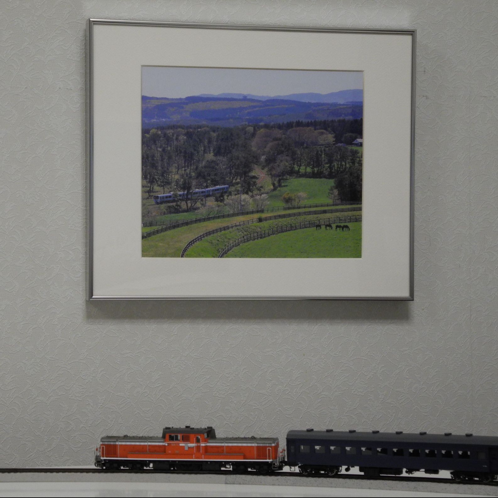 カレンダーの写真を切り出して、額に入れてホビールームの壁に飾り、視野の中で鉄道模型とイマジネーションが合成されるようにしてみました。