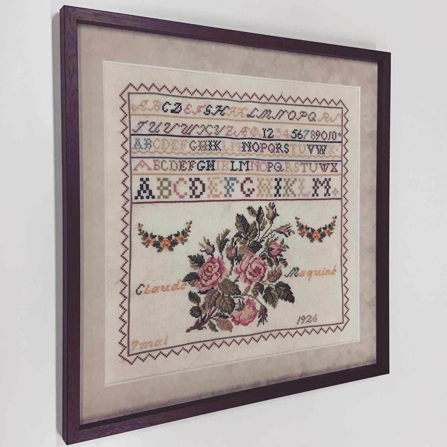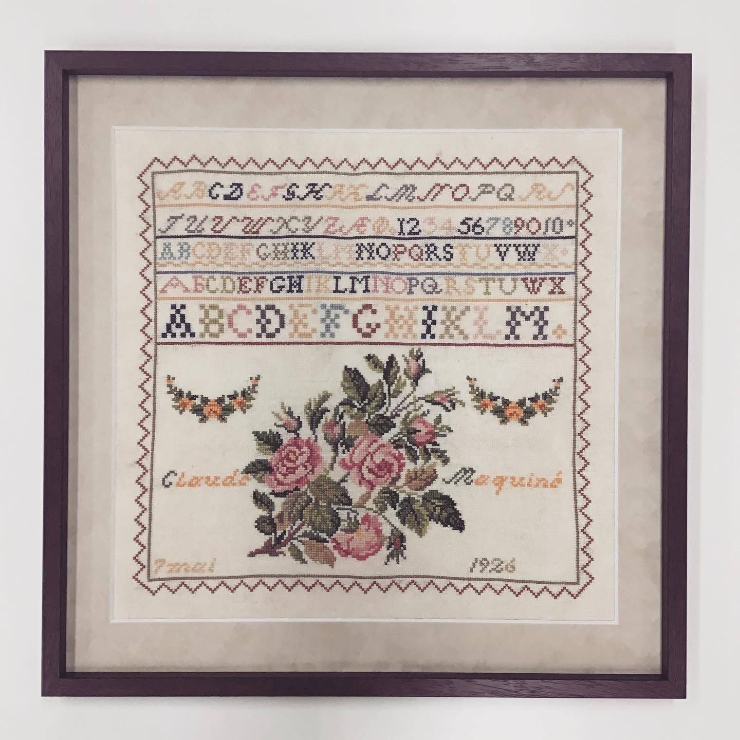 20世紀初期のクロス刺繍を額装しました。昔のイギリス由来のものとのことです。お店で日々お預りするクロスステッチと同じく、一針一針丁寧に仕上げられています。 当時の刺しゅう糸の染料が安定していない可能性を考え、熱もしくは水を必ず使うことになる裏打ちをせずに、持ち込まれたそのままの状態を額装しました(中性の両面テープを使用し、出来るだけ伸ばして額装してあります) 額縁は、正面から見た幅は細く奥行きの感じられるTG14(色名:マホ)、マットは、温かみのあるスエード象牙24601を使っています。 #額縁のタカハシ松本店 #額縁のタカハシ #額映え #額縁屋 #額縁店 #額装 #額縁 #額 #額縁アート #額縁職人 #刺しゅう #刺繍 #花 #刺しゅう # #裏打ち #クロス刺繍 #クロス刺しゅう #クロスステッチ #1929年 #アルファベット