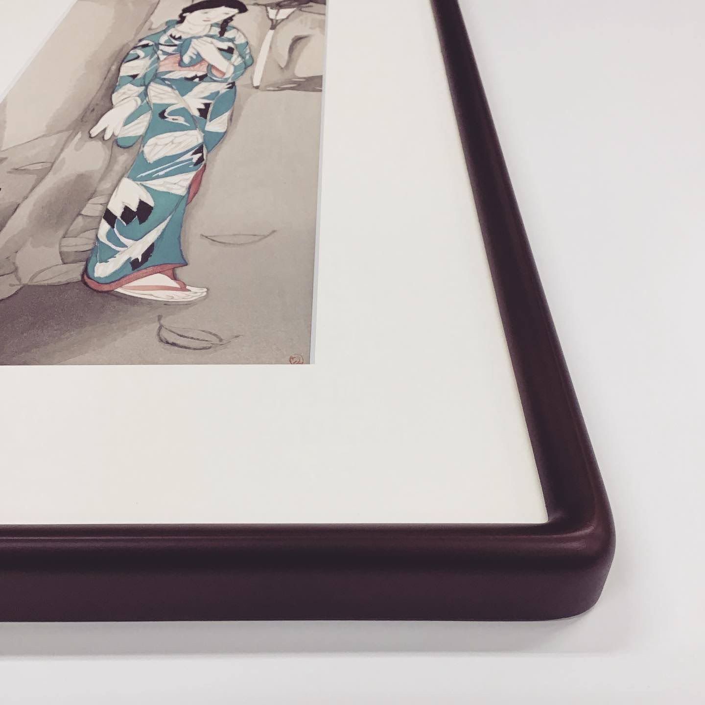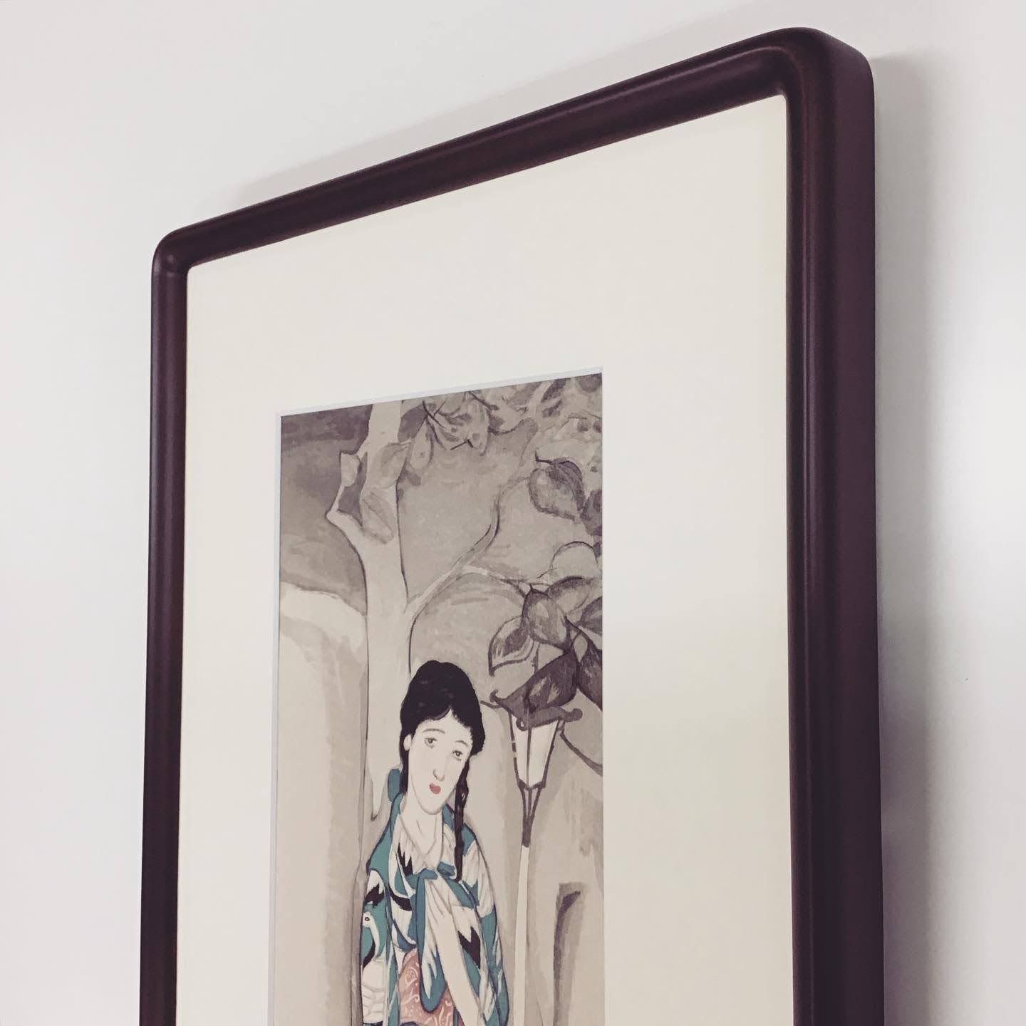 竹久夢二の浮世絵複製(1922年作 題:白夜)をお持ちいただき額装しました。 やわらかい線が多い竹久夢二の絵は時代を問わずファンが多いと思います。モダンに額装するもよし、こちらのようにさりげなく古風に飾るのも落ち着きます。 画集の複製画の両端の余白を切り落とし、絵のサイズに合わせて額を選びました。額は和風の隅丸額(D717セピア色・30×60cm内寸)を使用。マットは浮世絵や絵画の色の鑑賞に適したクリーム10042です。 #額縁のタカハシ松本店 #額縁のタカハシ #額映え #額縁屋 #額縁店 #額装 #額縁 #額 #額縁アート #額縁職人 #白夜 #竹久夢二 #夢二 #絵画 #大正 #大正ロマン #和装 #和額 #隅丸額