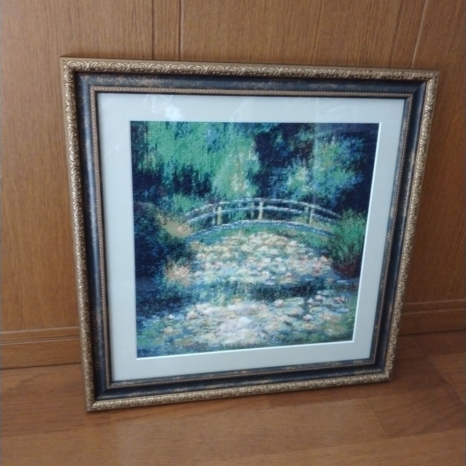 モネの水連を刺繍しました。古い絵なので重厚感のある額がいいかなと選びました