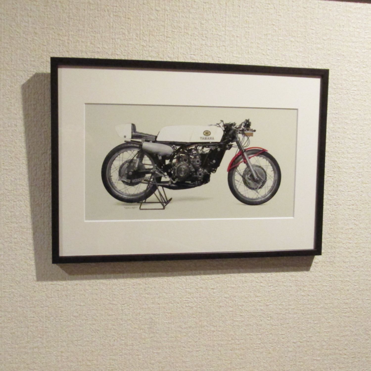 こちらは車格に合わせて少し小さめのフレームを使用、額装マットを入れる事で奥行きが出て品位がグッと上がりますね。 車体の前後端と上下端に対して額装マット開口部との隙間をどの位に取るか、そのバランスが難しいですが、先に掲載した黄色のマシン共々、以前本田コレクションホールで販売されていたものを参考として、寸法決めをしました。 次はスズキとカワサキのレーシングマシンを額装します。