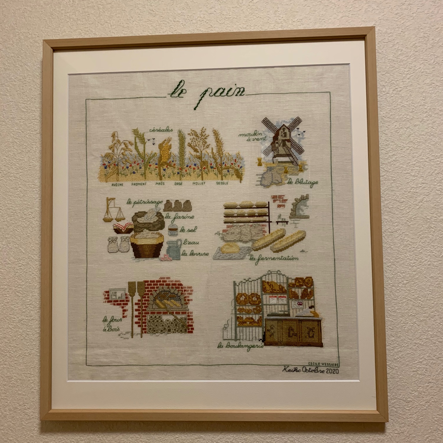 小麦の収穫からパン屋さんに並ぶまでの刺繍なんですね!😳すごく可愛らしくて温かみのある作品なので、ナチュラルなフレームがよく似合っています✨