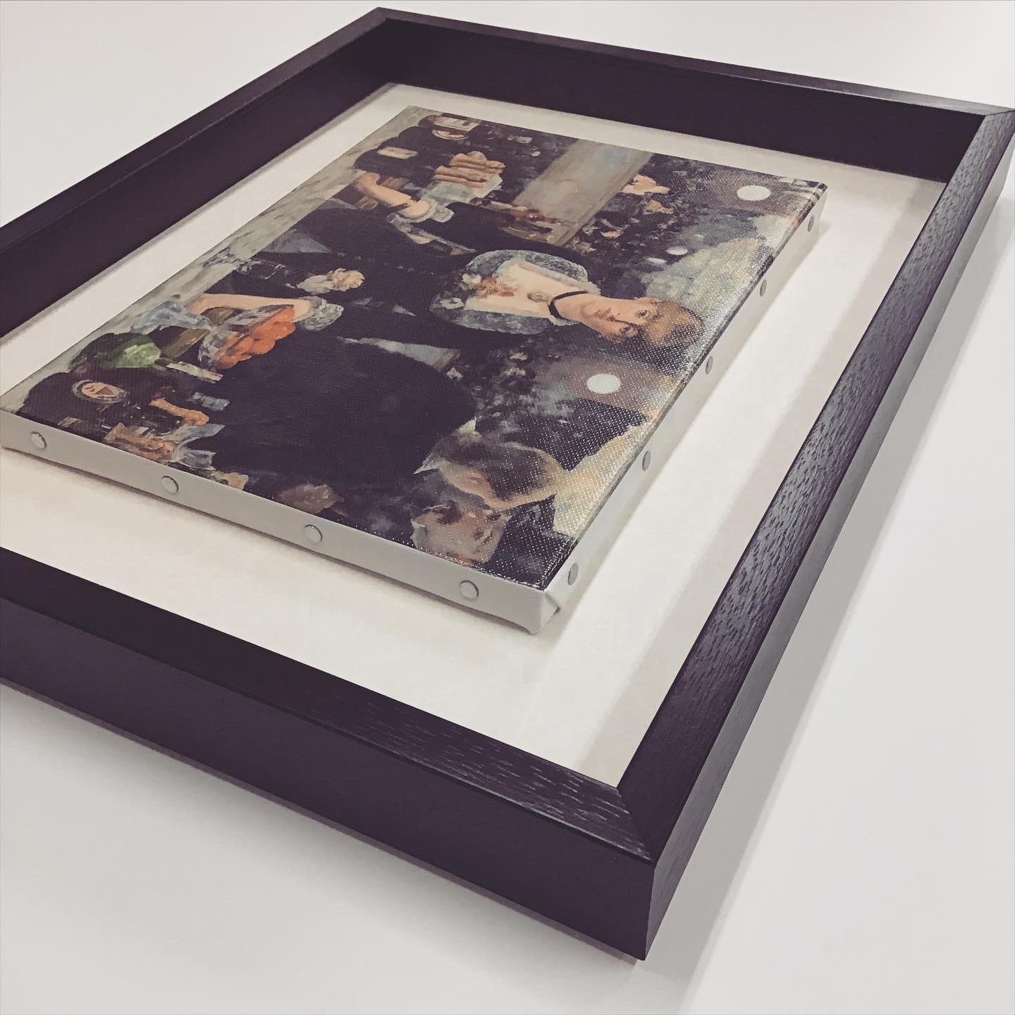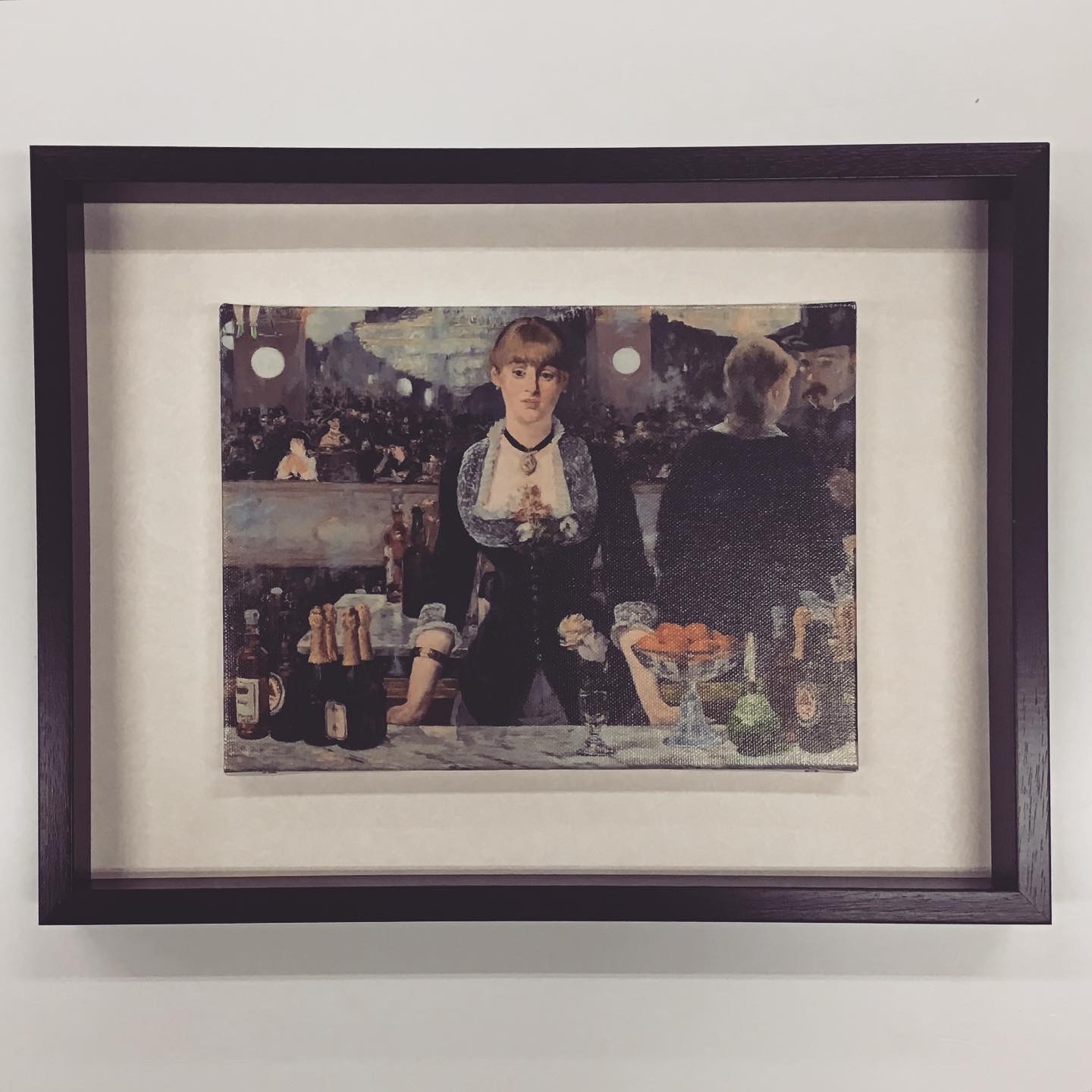 エドゥアール・マネ「フォリー・ベルジェールのバー」の複製画パネルを額装しました! 使用したフレームは「アートBOX35 オーク 太子」、背景のマットは少し模様のある白色のマット(20101)です。既製寸法のキャンバスではなかったため、キャンバスに対してひと回り大きいBOX型の額に裏からネジ留めをして額装しました。 #額縁のタカハシ松本店 #額縁のタカハシ #額映え #額縁屋 #額縁店 #額装 #額縁 #額 #額縁アート #額縁職人 #エドゥアールマネ #マネ #エドゥアール #フォリーベルジェールのバー #パネル画 #複製画
