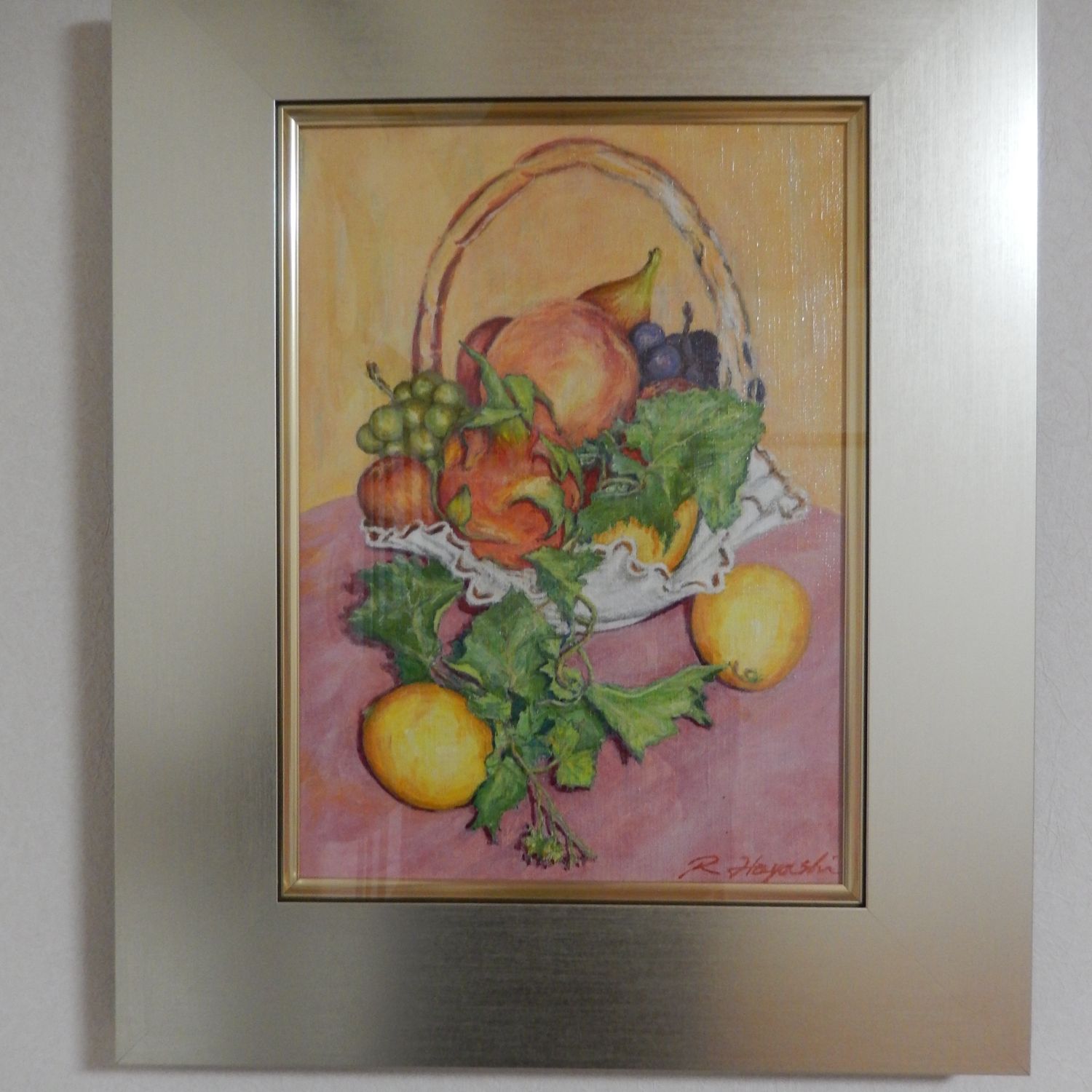 F4号の静物画です。ドラゴンフルーツの形と色が面白いと思い、画面中央左寄りに置きました。