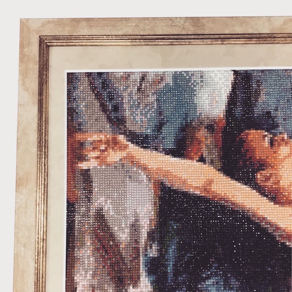 ダイヤモンドアート作品を額装しました! バレーダンサーの女性が踊っている様子が描かれている作品です。 小さなストーンを一粒一粒貼り付けて作られるダイアモンドアート、こちらの作品は約500×700mmくらいの作品です。これだけの作品が出来上がるのはどれくらいの期間が必要なんでしょうか…? ちなみにこちらの作品をお持ち込みされた方は、長手が2m近くの大きい作品を以前にお持ち込みされたことがあります。それは制作期間は約3ヶ月だったとのこと…すごいとしか言いようがありません。 今回、使用したフレームは「一般額 MH-E12J 大全紙 アイボリー」、マットはスエード象牙(24601)です。